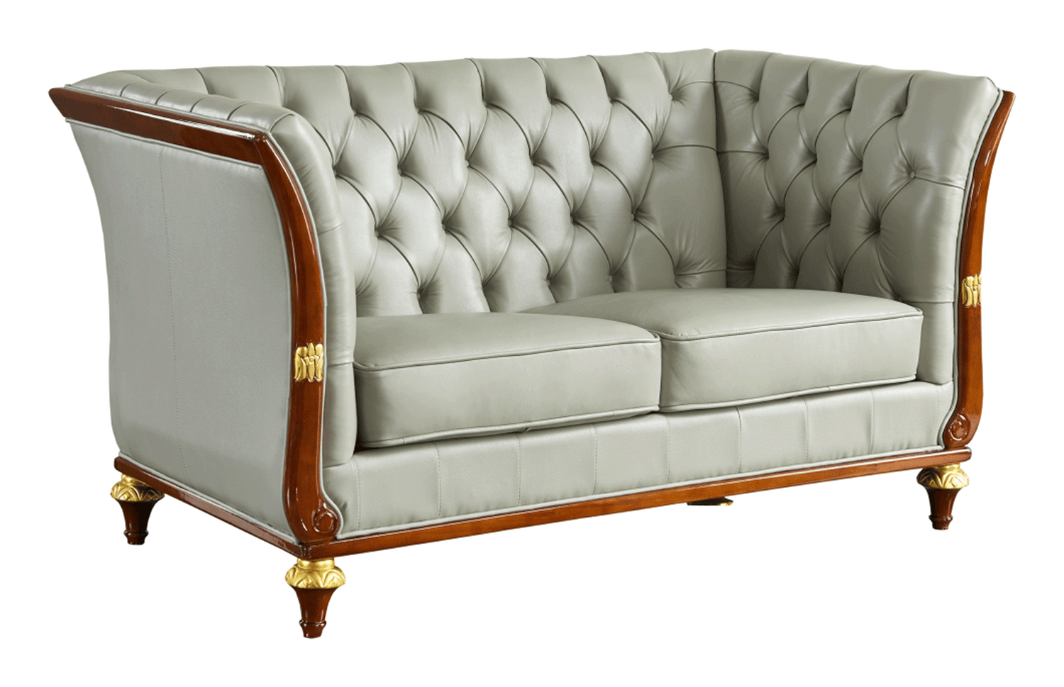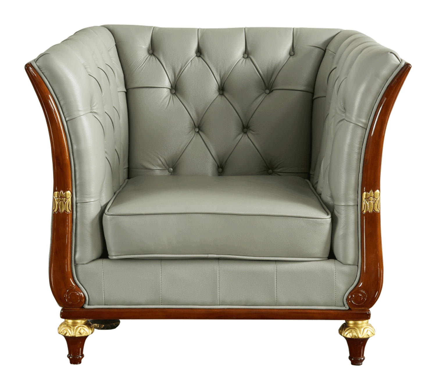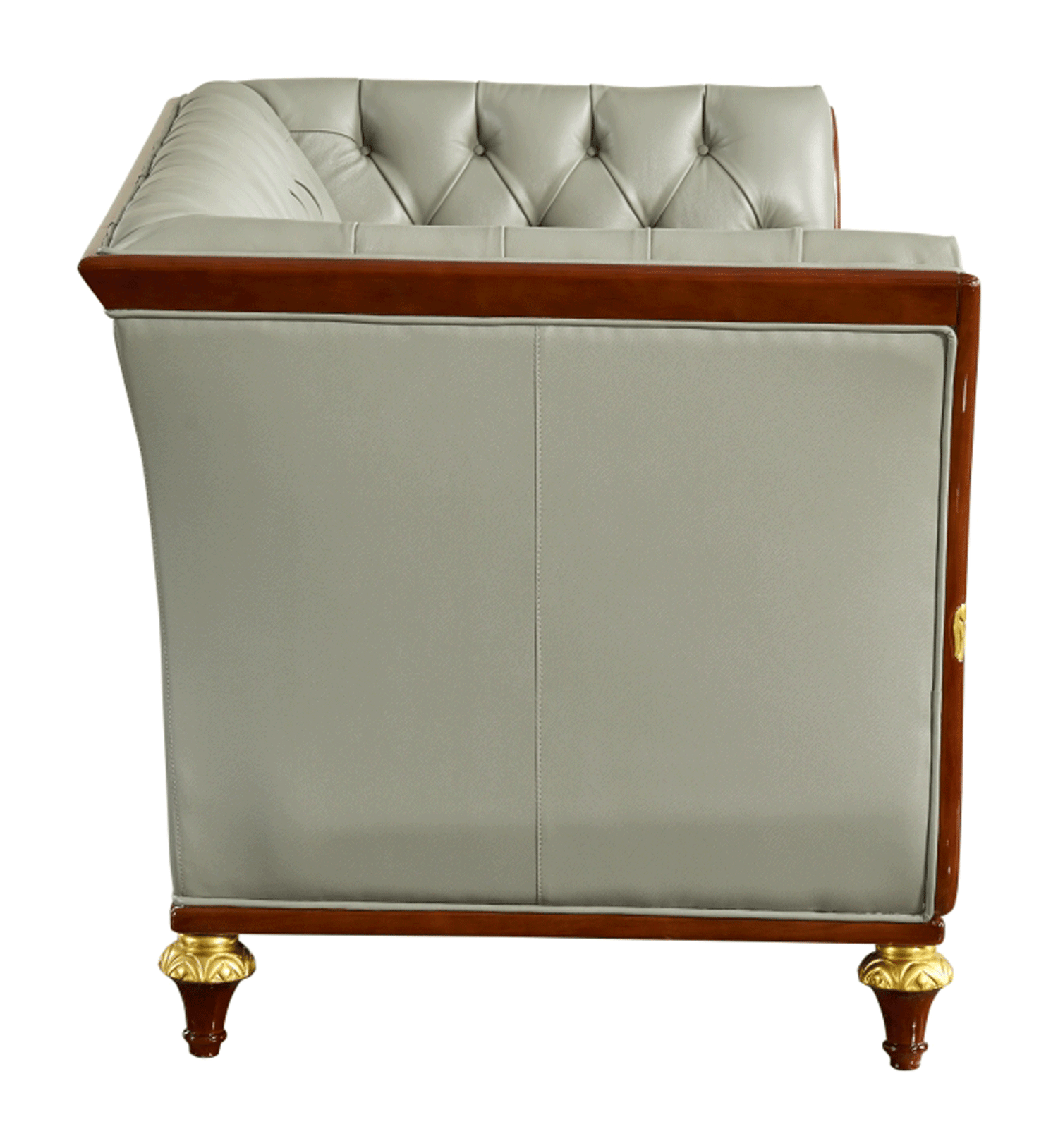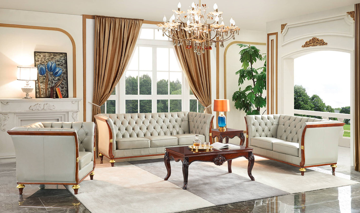 High-End Living Room Set in light grey leather color with brown wood and gold accent.