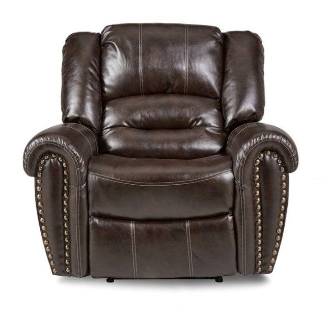 With plush seating that is uncommon in most traditional looks, the design of Center Hill Collection will be a welcome addition to your living room. The traditional nail head accent lends an elegant statement to the chair and the easy recline mechanisms adds to the comfort. This lovely seating offering will provide your friends and family a warm environment to spend their quality moment. The chair is offered in dark brown faux leather with manual reclining mechanism.