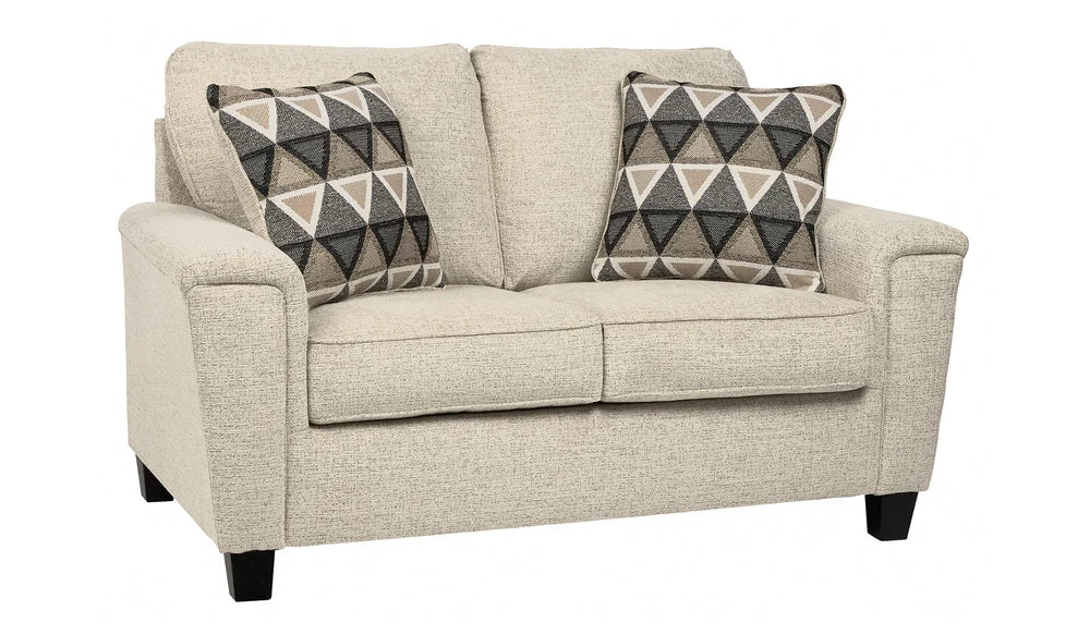 If you’re looking to lighten the mood, you’re sure to find the space-conscious, budget-conscious Abinger loveseat a breath of fresh air. Covered in a cream-tone chenille upholstery loaded with plush texture, this less-is-more contemporary loveseat is dressed to impress with angled side profiling and track armrests wrapped with a layer of pillowy softness for that little something extra. Crisp and clean, the 2-over-2 cushion styling adds up to one sensational look.- Corner-blocked frame