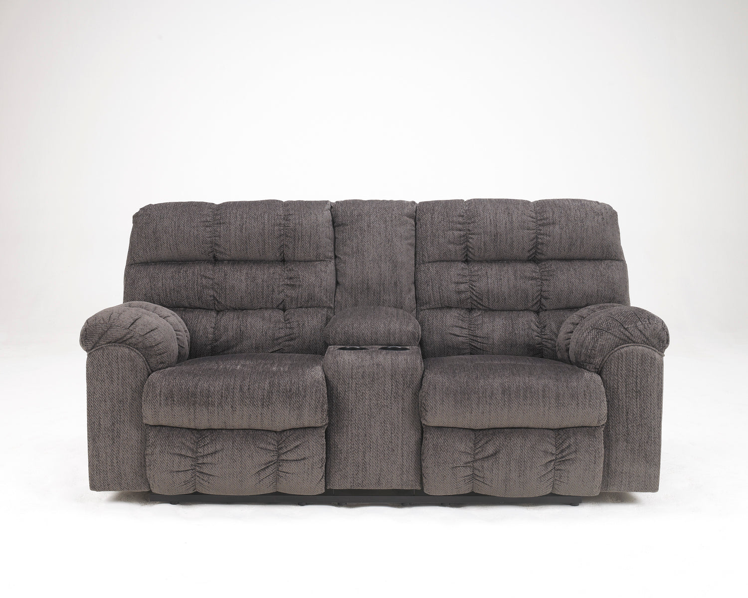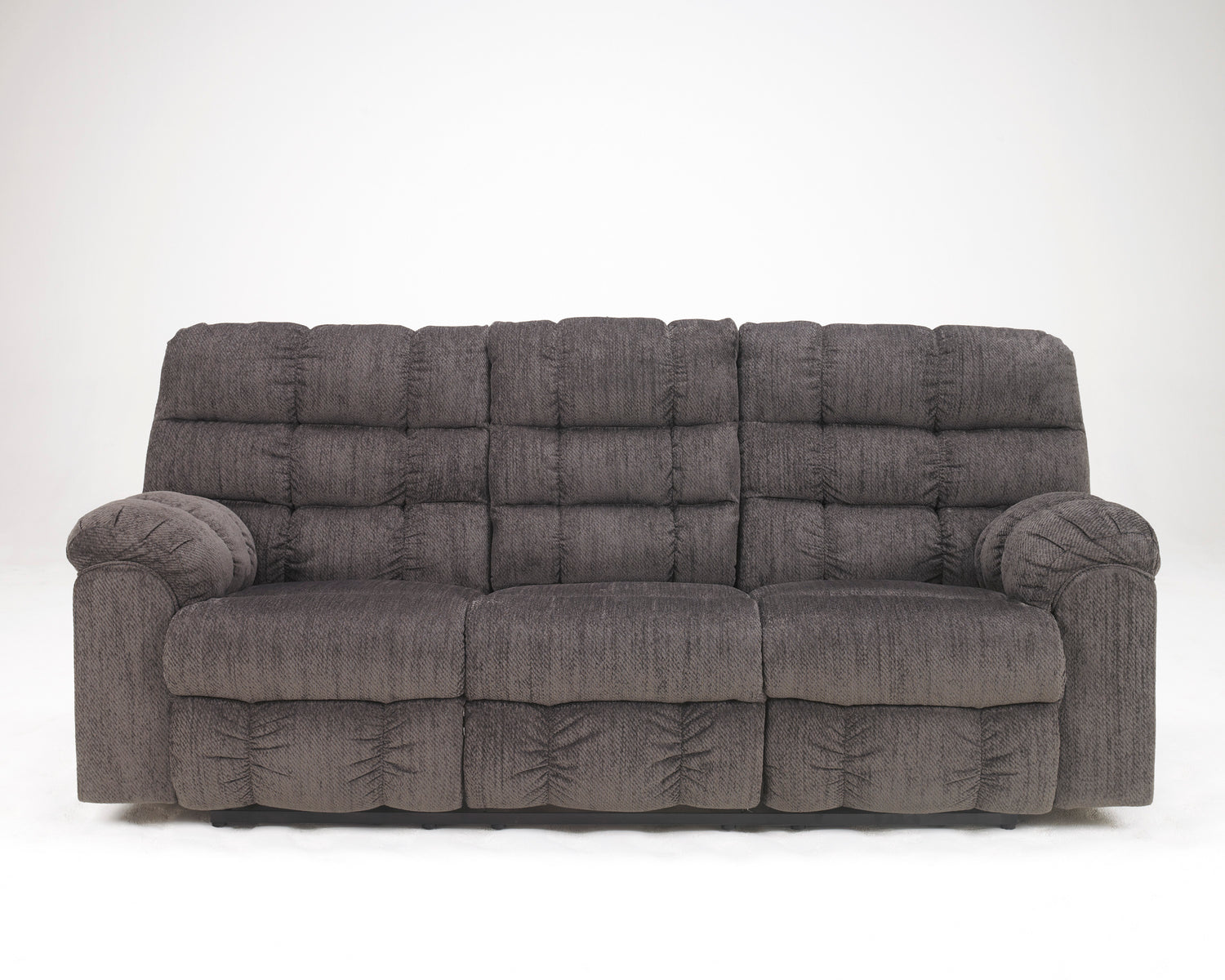 If its quilted bustle back weren’t enough, the Acieona reclining sofa and loveseat set has overstuffed arms that elevate comfort to new heights. The sofa and loveseat’s storage options—from a handy table top to cup holders and even an ingenious storage pocket—keep everything tucked away but still close at hand. Ultra-soft chenille upholstery makes this set beyond luxurious.- Includes reclining sofa and reclining loveseat