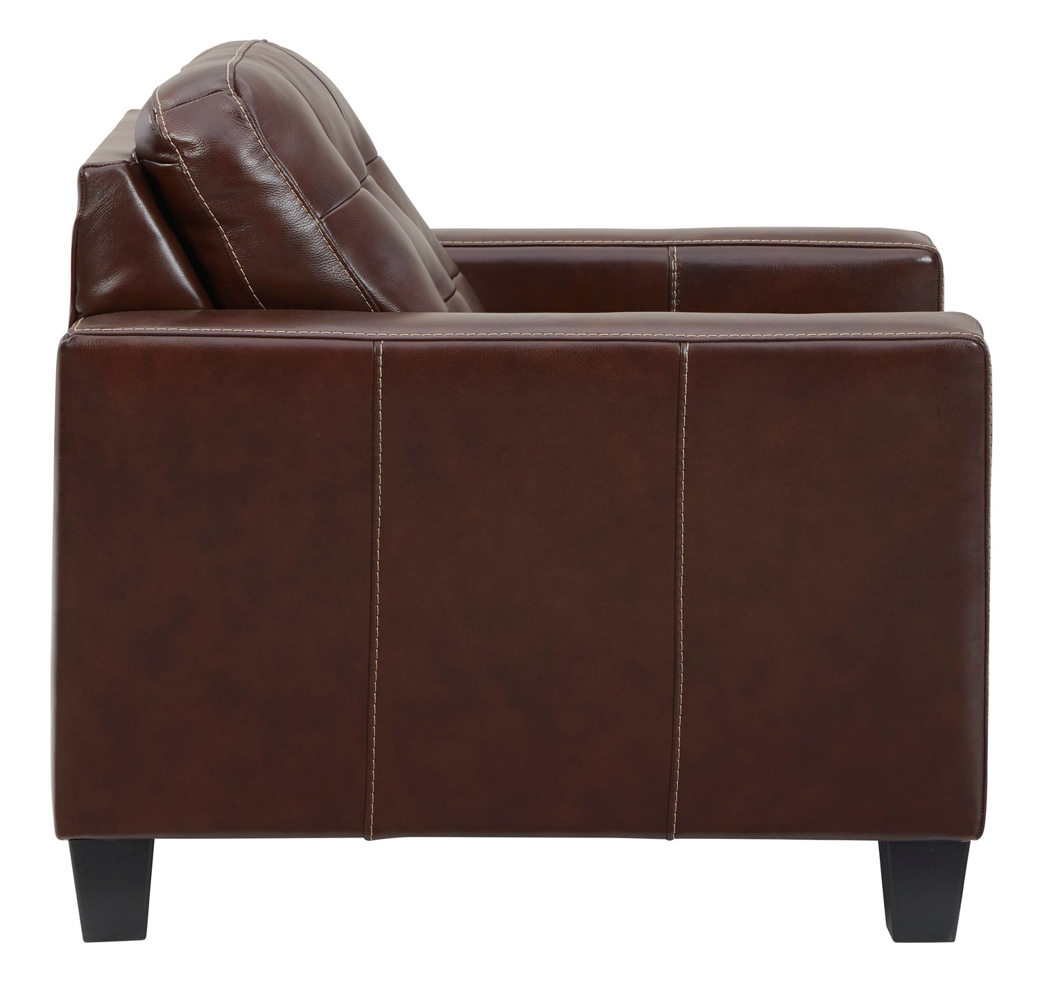 Tailor your space with the tidy structure of the Altonbury chair. Decorative stitching and button tufting on the box cushion make for a very neat appearance. With real leather covering the seating area—where it matters most—this piece has skillfully matched leather elsewhere, so you won’t get hemmed in by the price.- Corner-blocked frame