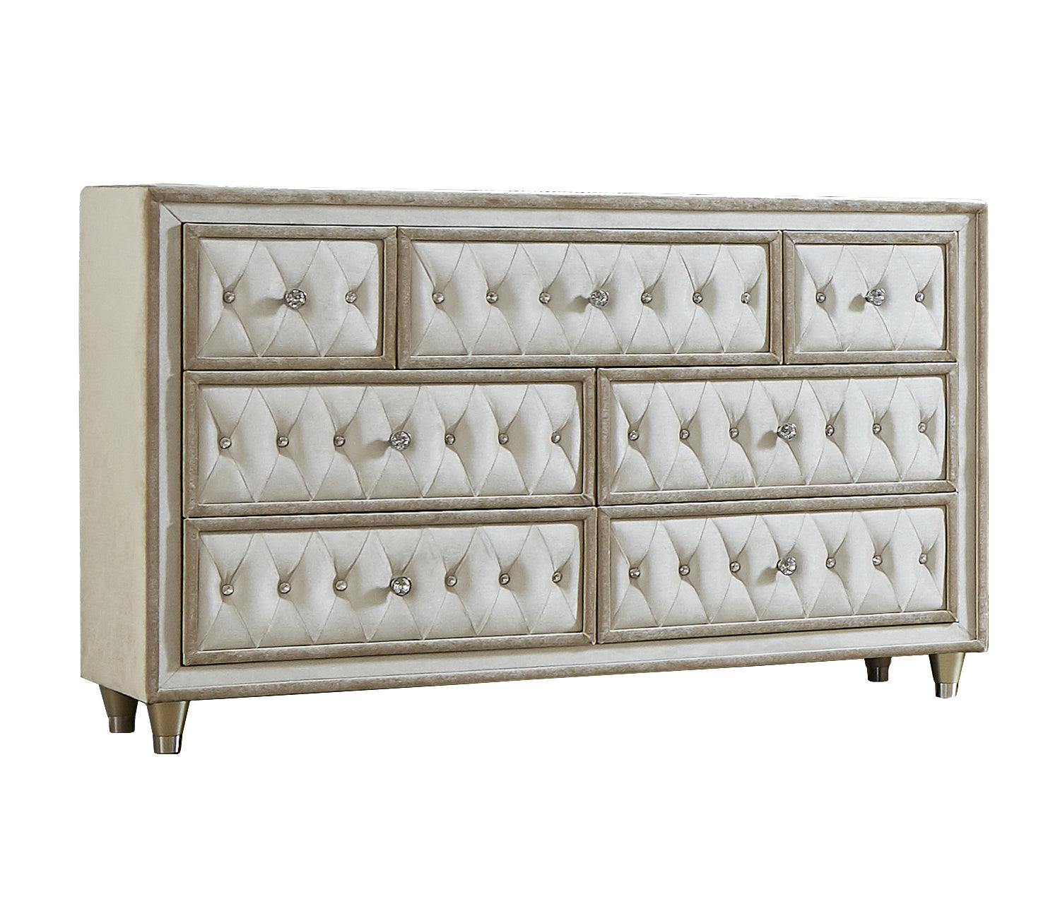 A traditional and modern bedroom set meets all expectations for an incredible impact in your sleeping space. Smooth and soft upholstered enhances each piece in this set. Coming in a camel and ivory color, this set is inspired by French Provincial decor. Crystal-like accents make their presence known within the button tufting. Gorgeous nailhead trim adds the finishing touch on this upholstered bedroom set.