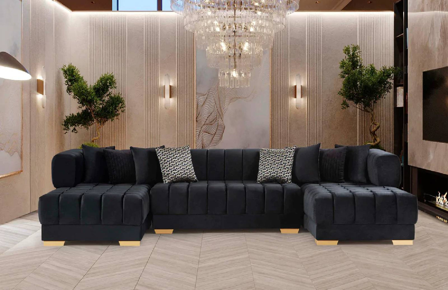 Wide armrests, soft cushioning, sinuous lines, deeps seating and tufting. The Ariana sectional has an enhanced horizontality which adds an elegant, modern touch. It comes with rich color options.