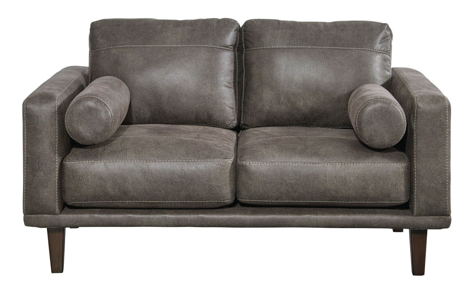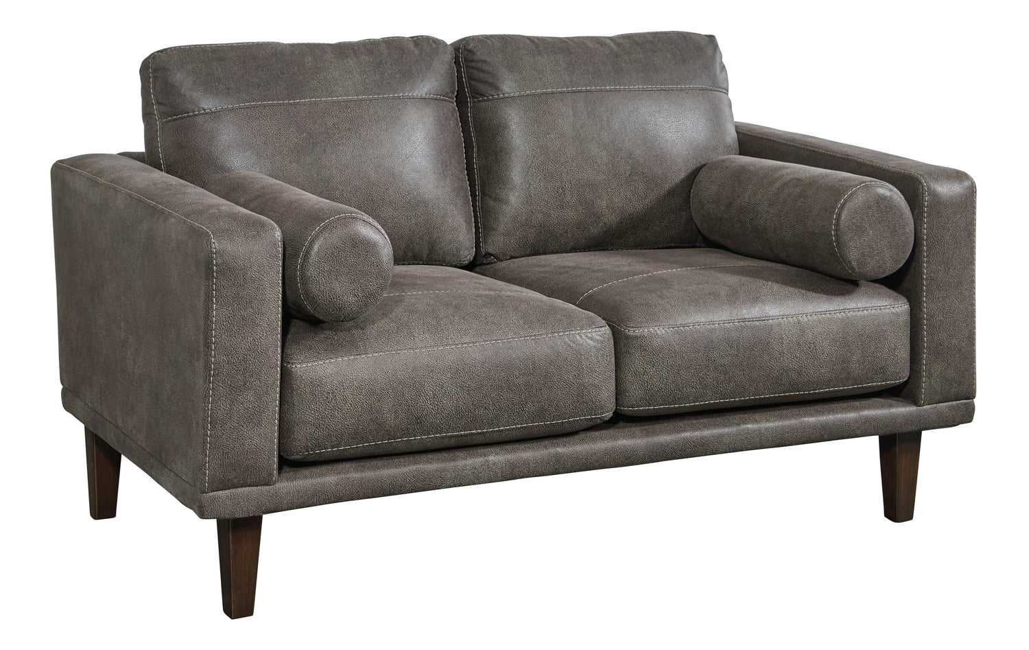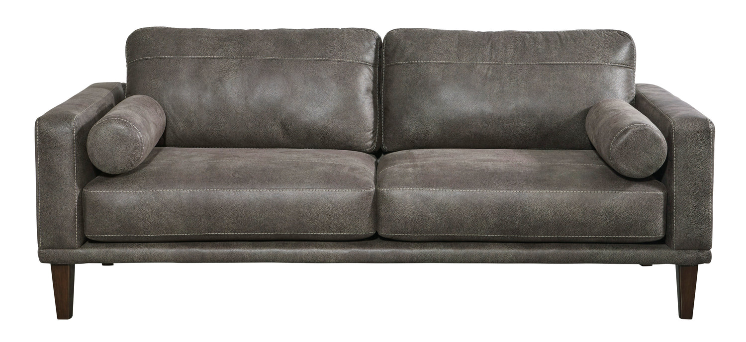 For a fresh spot in your space, turn to the Arroyo designer sofa. This invigorating piece breathes warmth into your home with its striking gray faux leather upholstery, modern bolster pillows and tapered legs. Wind down at the end of a long day when you sink into this canyon of comfort.- Corner-blocked frame