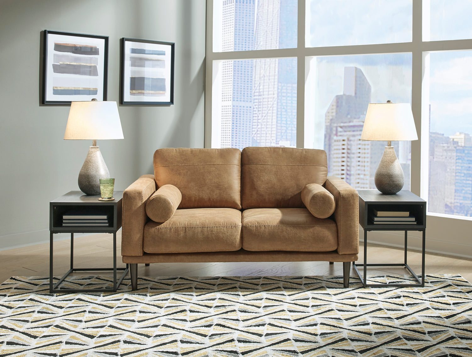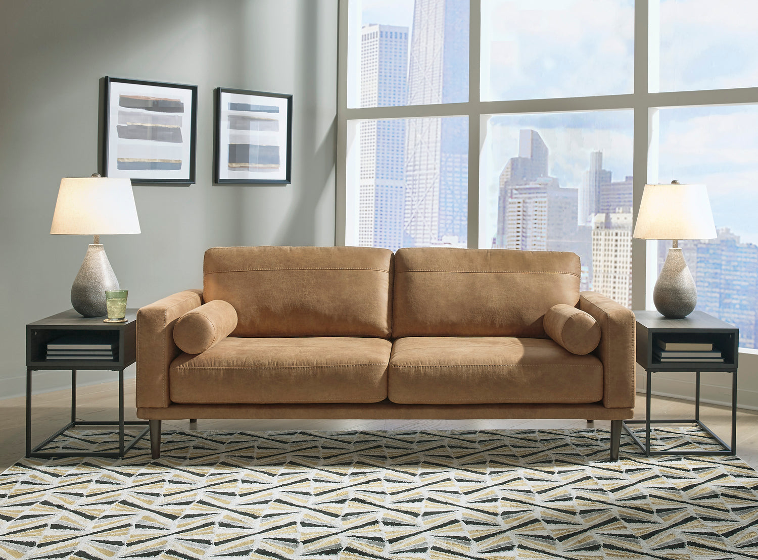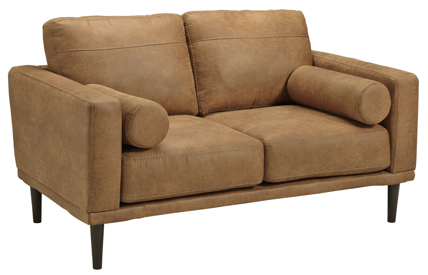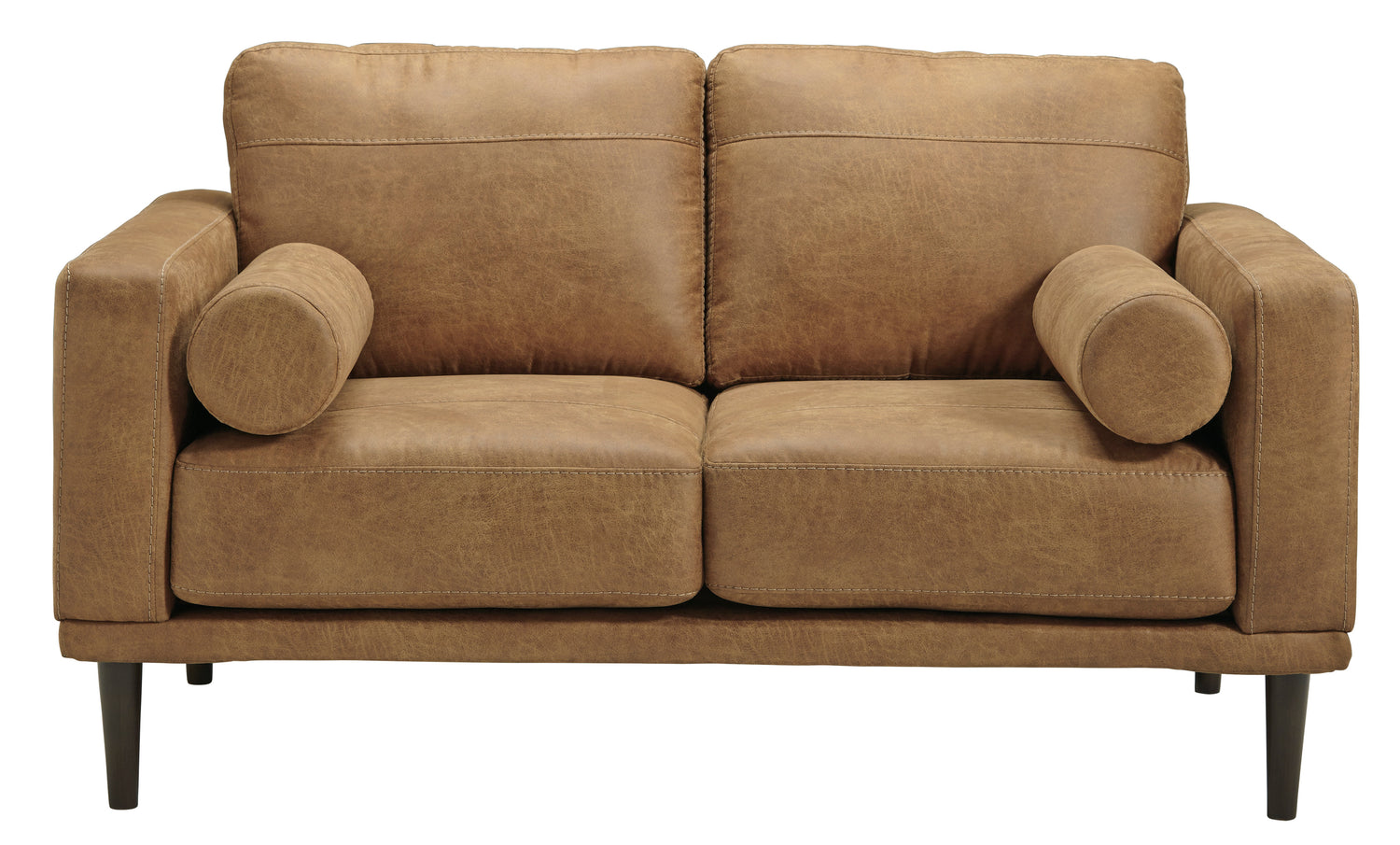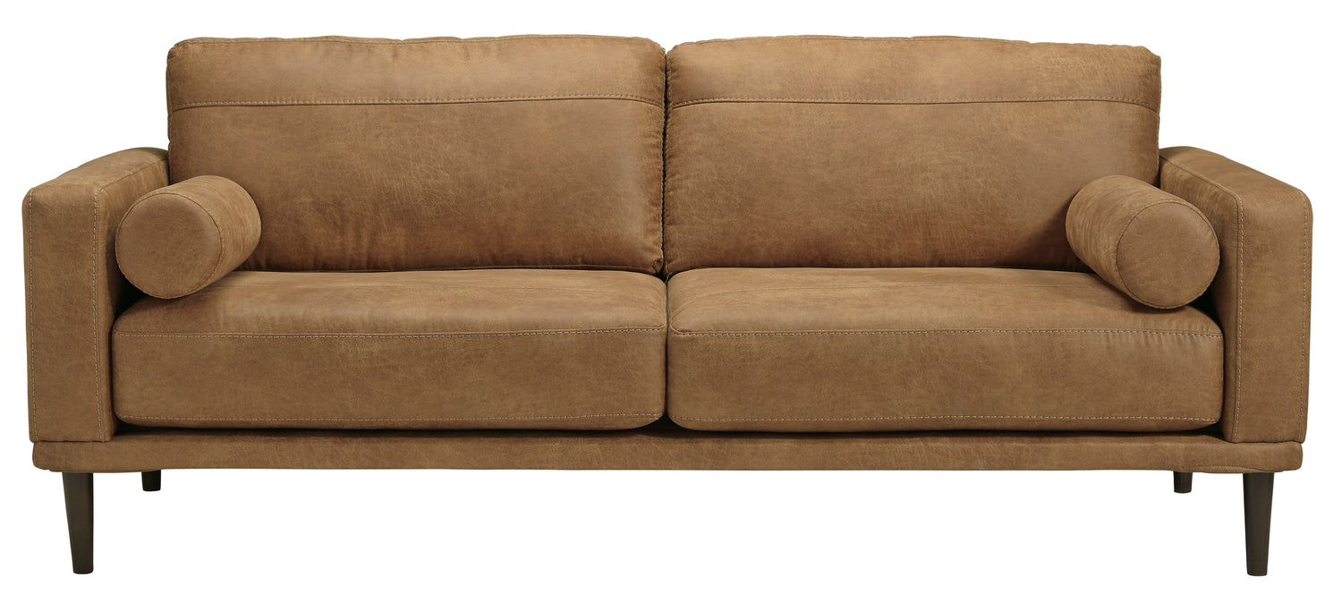 For a fresh spot in your space, turn to the Arroyo sofa. This invigorating piece breathes warmth into your home with its striking caramel faux leather upholstery, modern bolster pillows and tapered legs. Wind down at the end of a long day when you sink into this canyon of comfort.- Corner-blocked frame