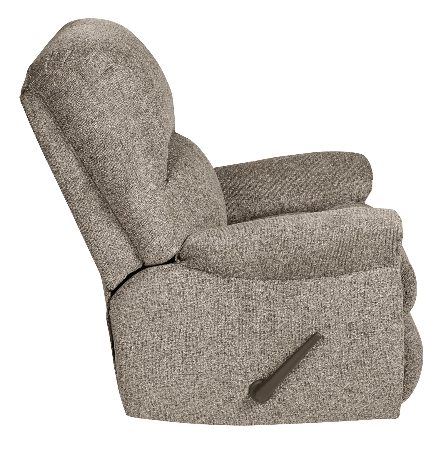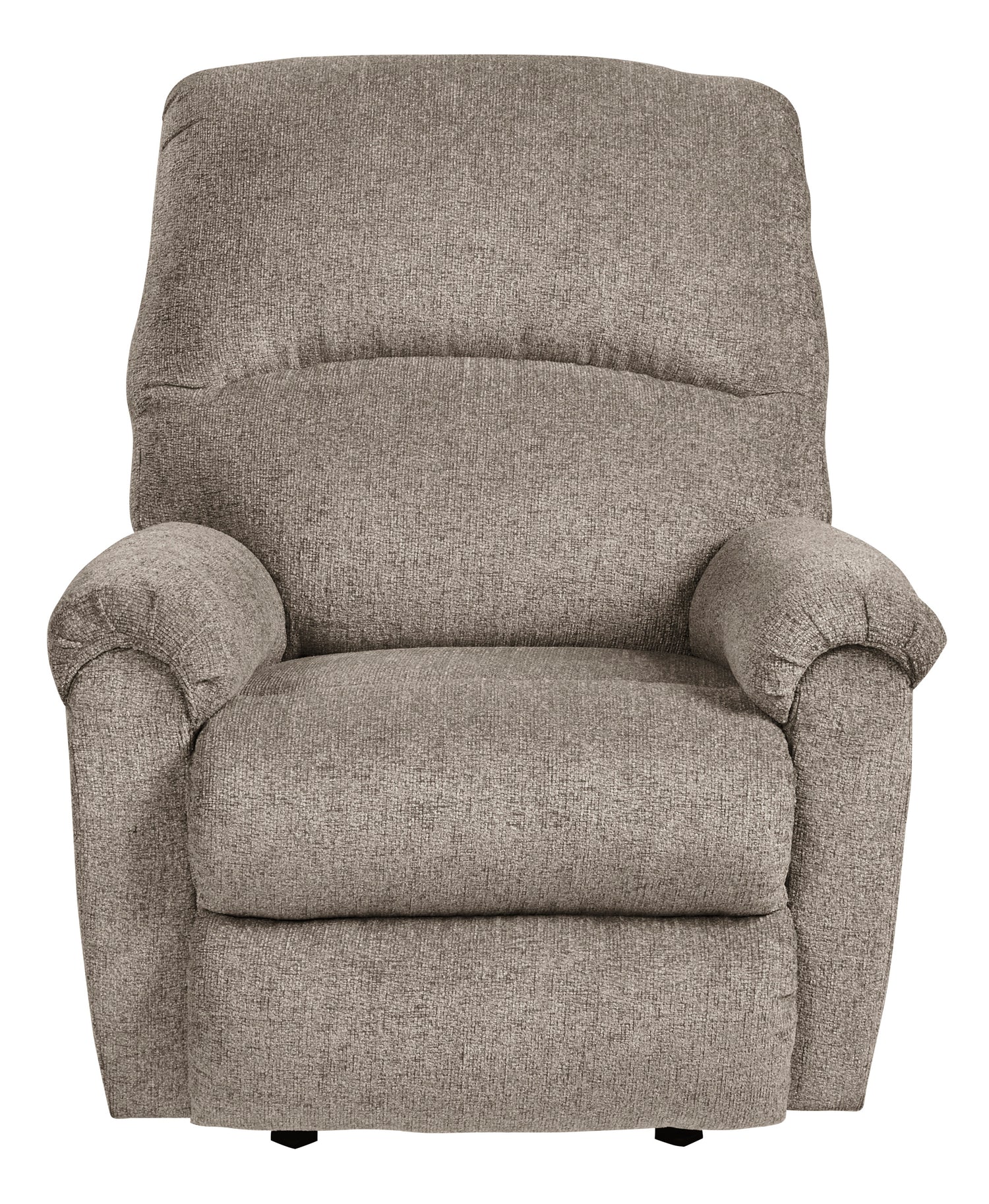 A mastery in less is more, the Ballinasloe rocker recliner manages to make cool, contemporary design so warm and cozy. A new twist on neutral, the recliner’s soothing “platinum” tone upholstery is incredibly plush to the touch. Curved divided back and deeply tufted footrest give the clean-lined profile a sense of sumptuousness impossible to resist.- One-pull reclining motion