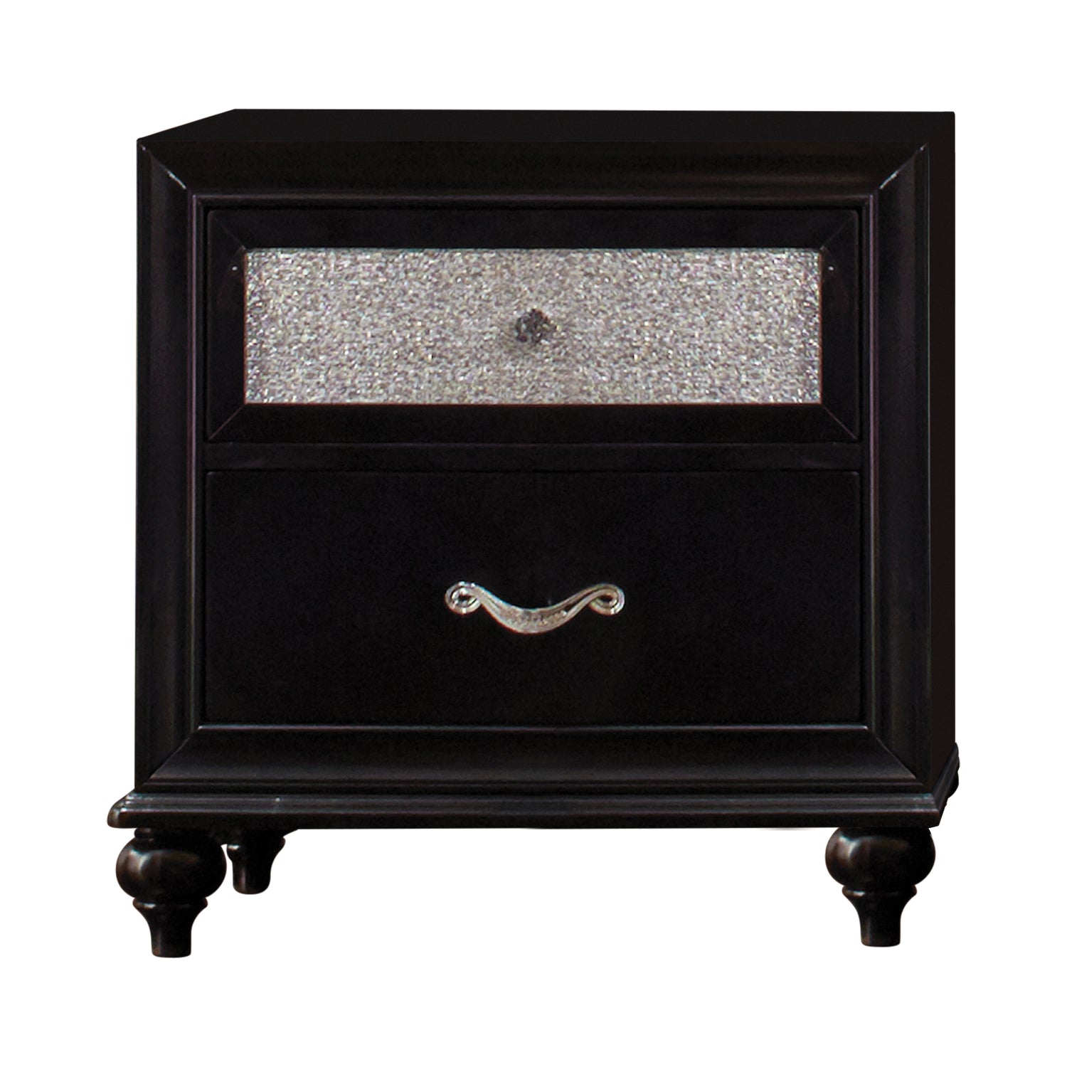 Add bling and pizzazz to the bedroom with this fabulous 5-piece bedroom set from the Barzini collection, featuring an impressive headboard and low-profile footboard on the glamorous bed, both upholstered with metallic leatherette-padded fabric. The nightstand, chest, and dresser all offer ample storage space with plenty of drawers. Each of these pieces are crafted with drawers featuring metallic acrylic fronts that are highlighted by faceted crystal hardware. A tall, rectangular mirror is designed to be put atop the dresser to complete the set. Each piece features a sumptuous black for a dark, Godfather-like ambiance.