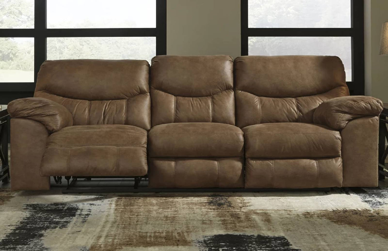 Rock the cool look of leather minus the hefty price tag with the Boxberg power reclining sofa. Rich with tonal variation, the indulgently soft upholstery sure looks like the real thing. And talk about indulgent comfort. Double stuffed armrests and sumptuous cushions cradle and support in all the right places. Distinctive scooped stitching enhances this reclining sofa’s contemporary flair.- Dual-sided recliner; middle seat remains stationary