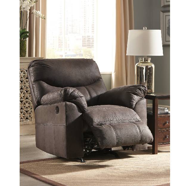 There’s no shame in sacking out and kicking back, not when you look as good as you do in the Alliston rocker recliner. Practical faux leather upholstery is enriched with subtly tufted detailing, a supportive back and padded arms. The result: comfort and style that go hand in hand.- Pull tab reclining motion