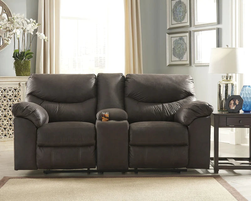 Rock the cool look of leather minus the hefty price tag with the Boxberg reclining loveseat with console. Rich with tonal variation, the indulgently soft upholstery sure looks like the real thing. And talk about indulgent comfort. Double stuffed armrests and sumptuous cushions cradle and support in all the right places. Distinctive scooped stitching enhances this reclining loveseat’s contemporary flair. Cup holders and hidden storage complete the experience.- Dual-sided recliner