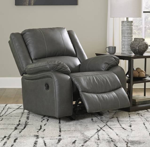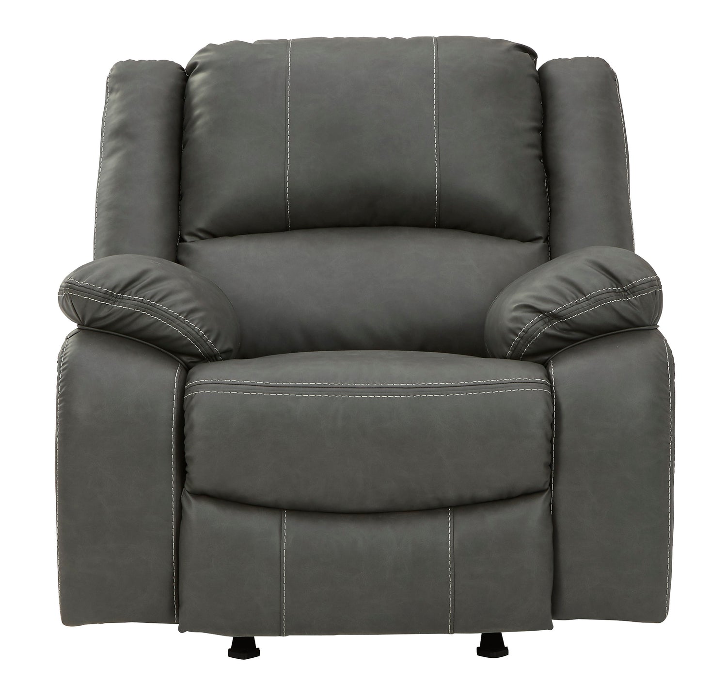 Sleek and streamlined, the Calderwell rocker recliner draws out your leisure time with its bustle back construction and thickly cushioned armrests. The super soft faux leather gets a high-end tweak with jumbo contrast stitching so you don’t have to sacrifice style for comfort. Sink into the comfortably supportive cushions and stretch your evening as long as you can.- Gentle rocking motion