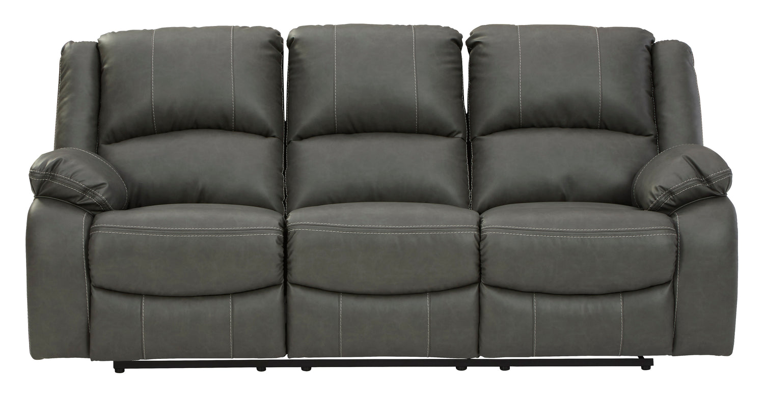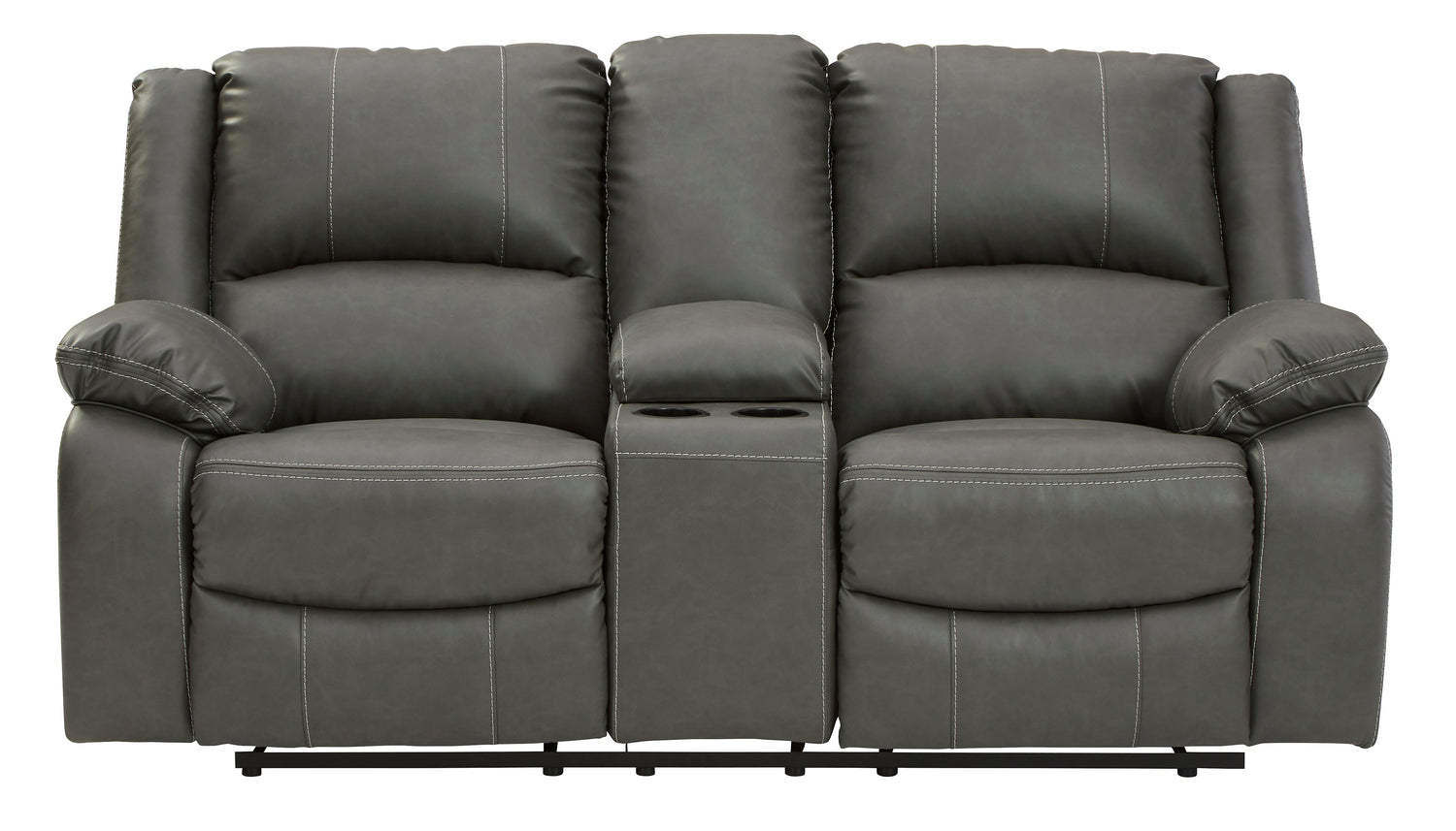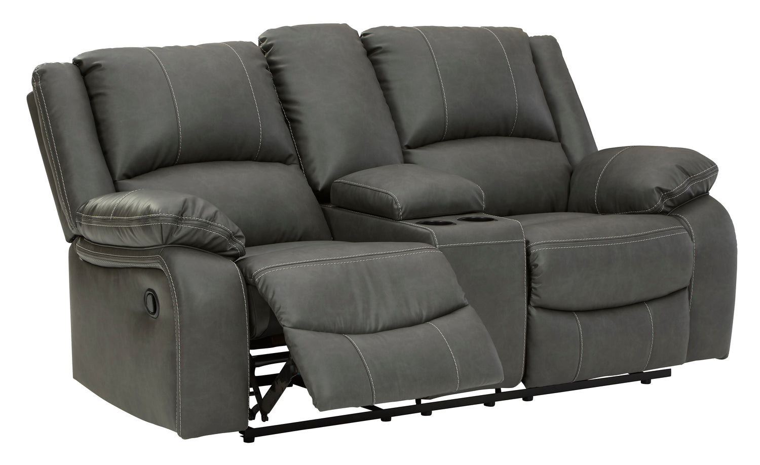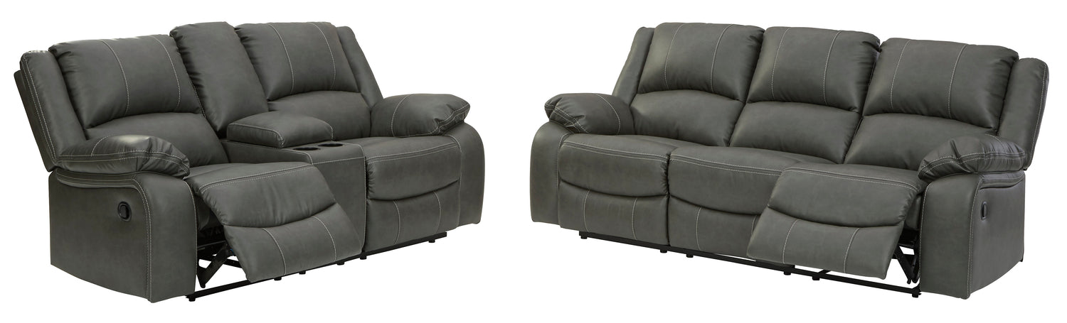 Sleek and streamlined, the Calderwell reclining sofa and loveseat with console set draws out your leisure time with its bustle back construction and thickly cushioned armrests. The super soft faux leather gets a high-end tweak with jumbo contrast stitching so you don’t have to sacrifice style for comfort. Sink into the comfortably supportive cushions and stretch out your evening as long as you can.- Includes reclining sofa and loveseat with console