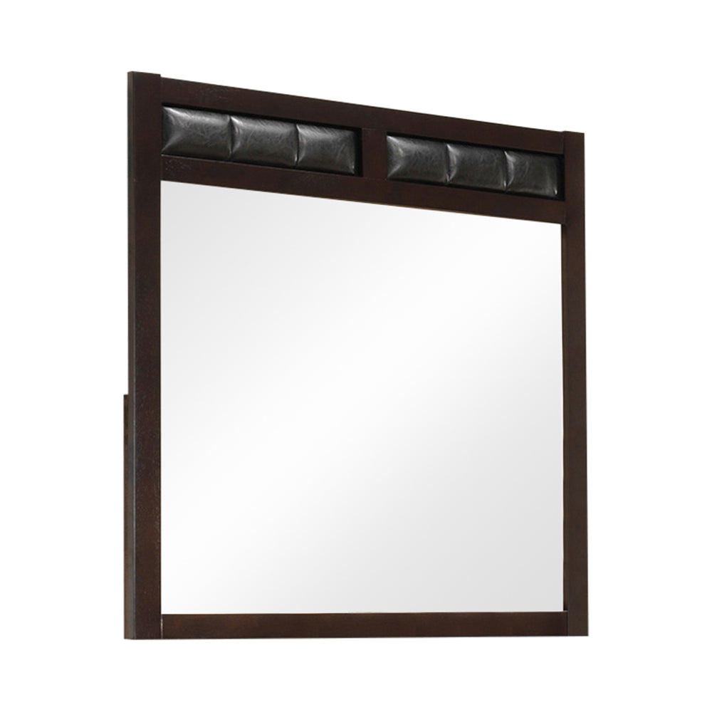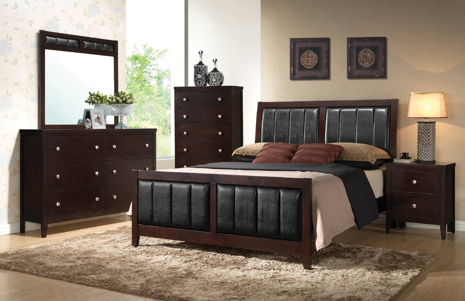 From the Carlton collection comes this handsome 5-piece bedroom set featuring padded black leatherette paneling throughout. The sumptuous padding on the bed is found on the headboard and footboard for a stately appearance. The nightstand and chest are characterized by deep drawers and spacious tops for a lamp or decorative vases. The dresser has six spacious drawers and enough space on for the accompanying mirror, which is highlighted by padded leatherette on top. The set's black leatherette is a handsome contrast to the warm cappuccino finish.