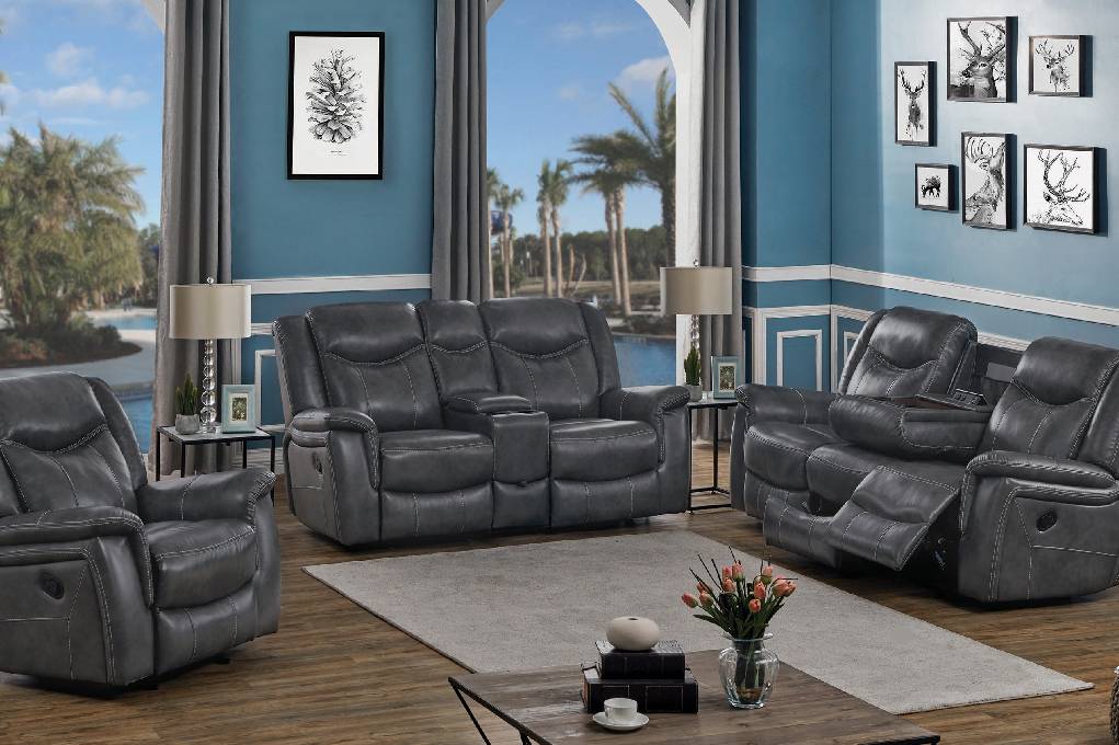 Grey is the trendy color these days and it doesn't look any better than on this opulent motion living room set.