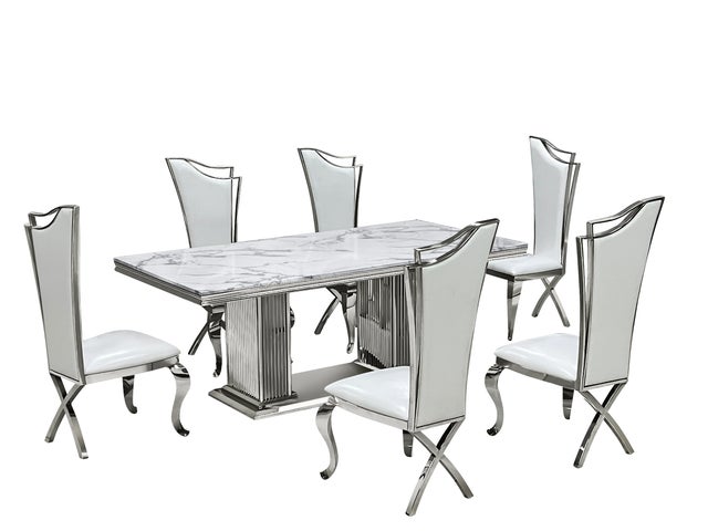 Description: Marble/Stainless Steel Dining Table + 6 Chair set only.