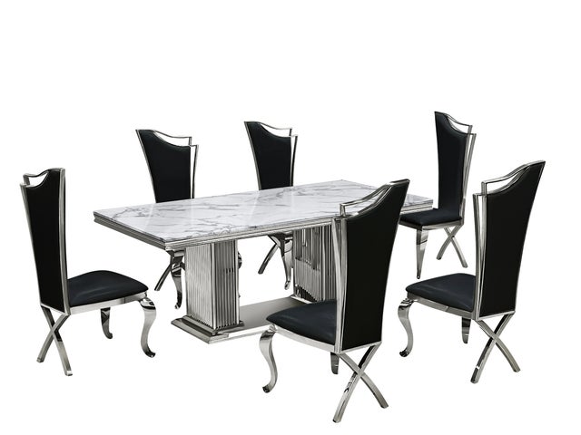 Description: Marble/Stainless Steel Dining Table + 6 Chair set only.