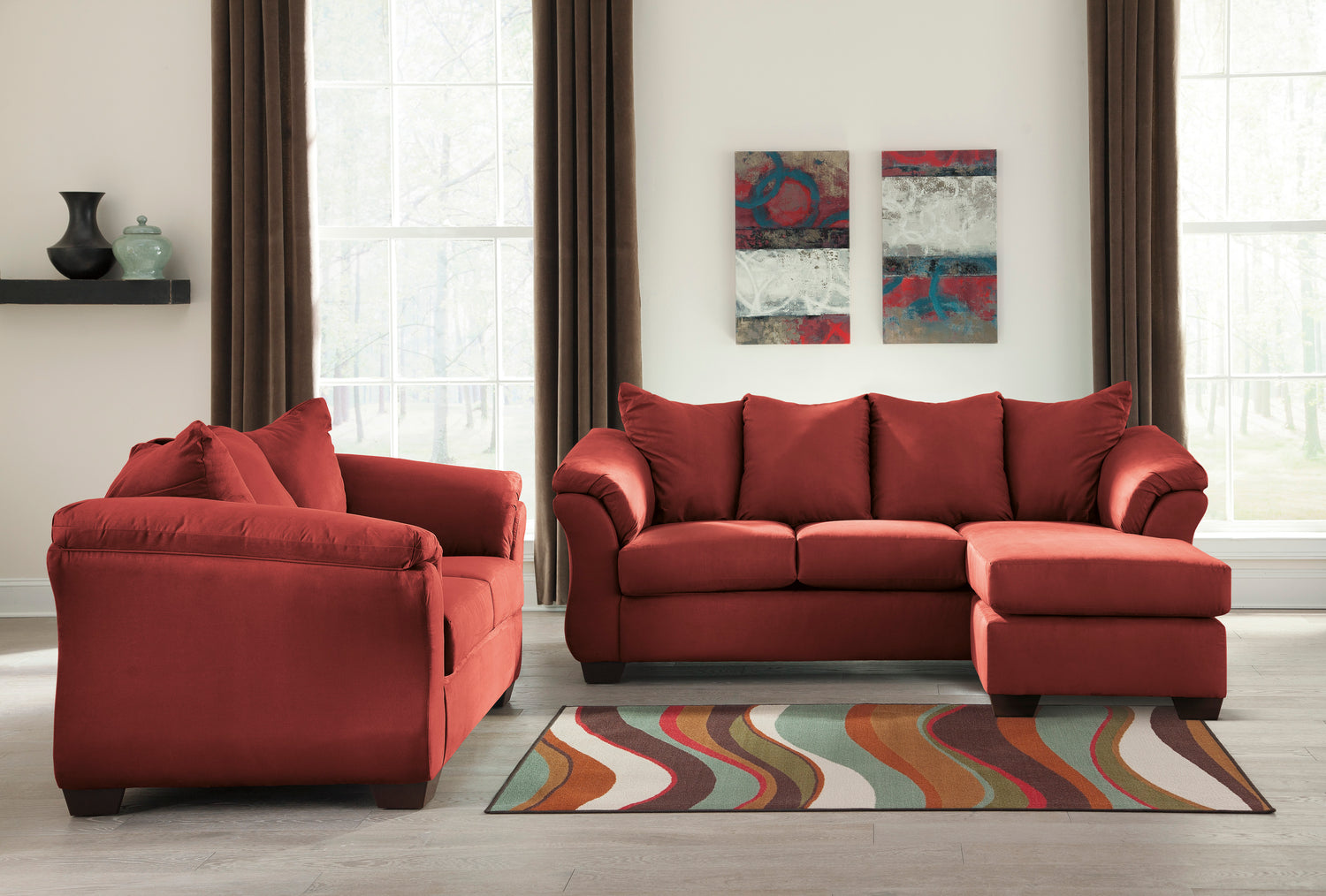 Talk about fine lines and great curves. That’s the beauty of the Darcy living room set—made to suit your appreciation for clean, contemporary style. A striking flared frame, comfy pillow top armrests and an ultra-soft upholstery that holds up to everyday living complete this fashion statement.- Includes sofa chaise and loveseat