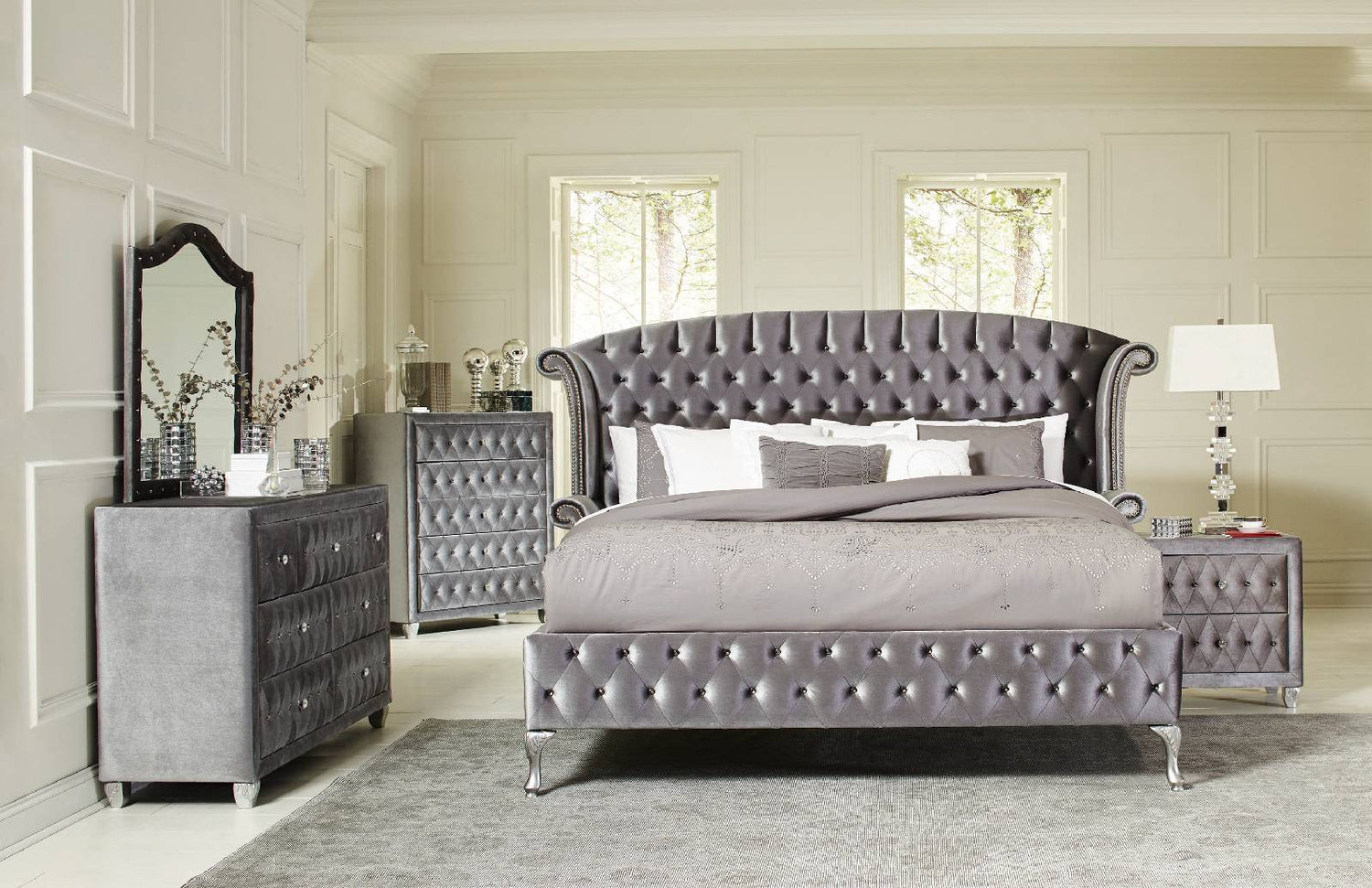 This regal five-piece bedroom set is designed to make any master bedroom a true modern masterpiece, as each piece is crafted in an elegant metallic finish with luxuriant gray button tufted fabric. The imposing rolled headboard and armrests of the eastern king bed have contrasting nailhead trim for added style. The night stand has two drawers and fits a favorite table lamp for convenience. The seven-drawer dresser has a table top big enough for the accompanying curved-top mirror that has an alluring nailhead trim. The chest has five roomy drawers for storage of extra bed linens and thick sweaters.