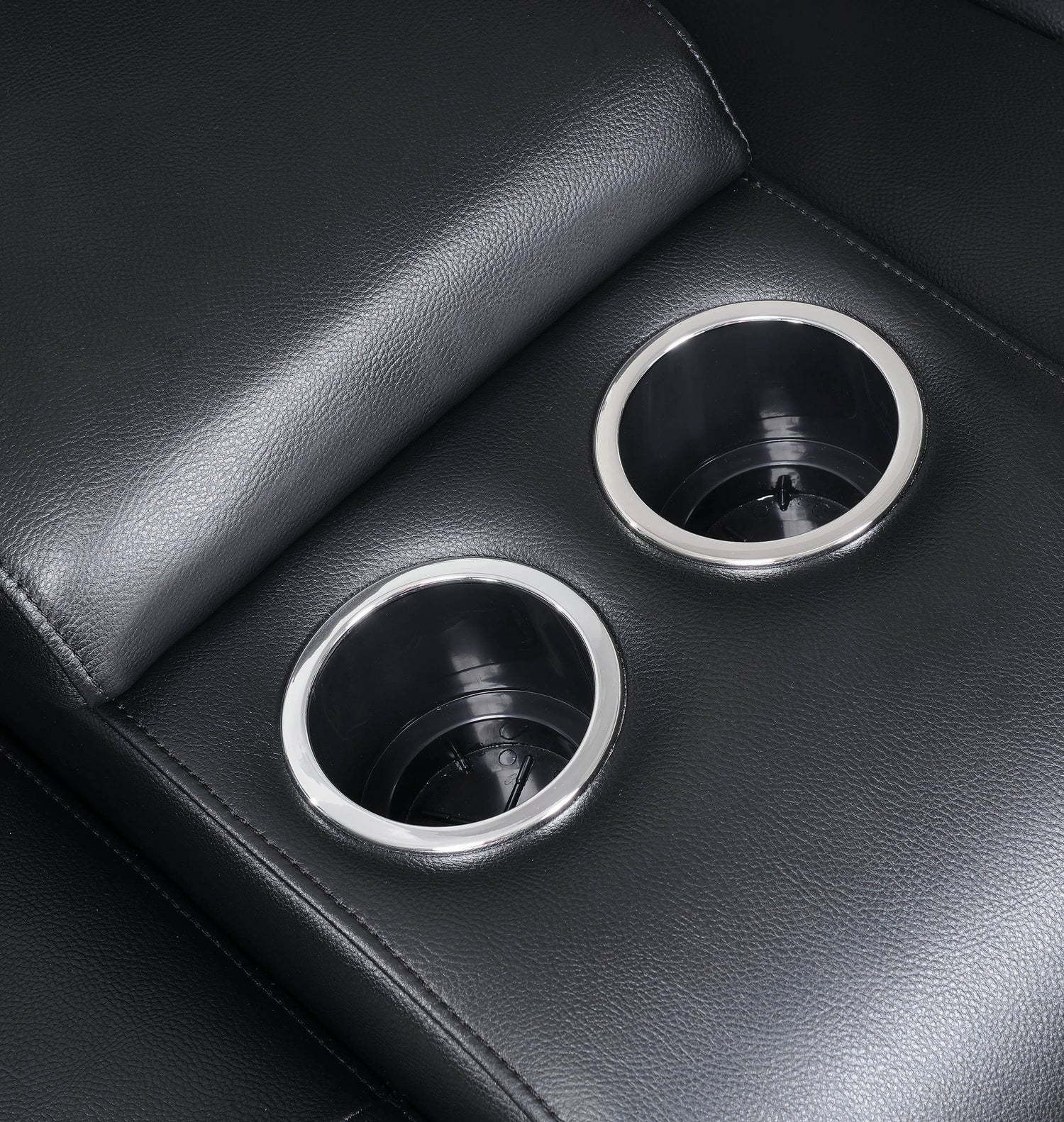 Celebrate casual comfort with the sleek style from this three-piece power motion set. Power headrests and hidden LED lights in the sofa, loveseat, and recliner offer the ultimate relaxation. Streamlined and convenient, the drop down backrest with cupholders offers versatility. Pop up wire management and USB ports make this set perfect for an entertainment room. Store remotes or other necessities in the additional storage in the armrests, complete with a smooth black padded leatherette upholstery.