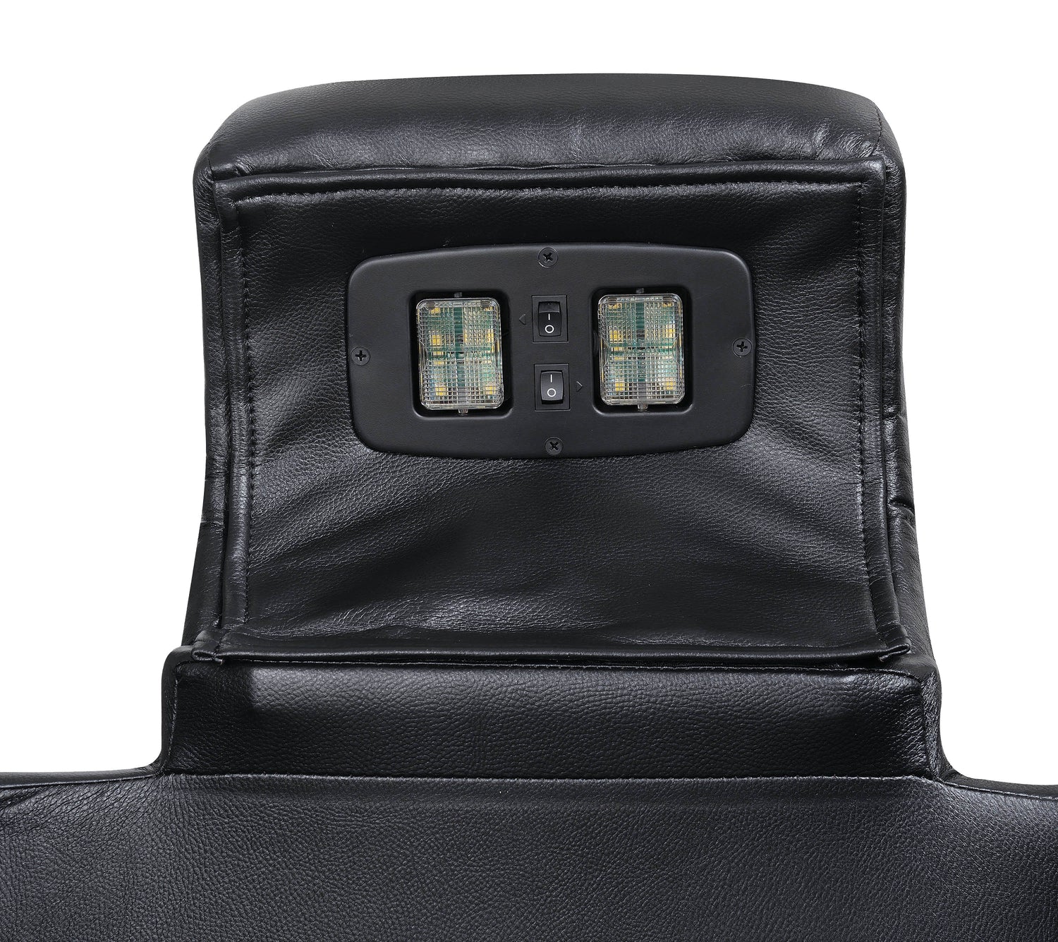 - Sofa features drop down table with dual LED reading light, pop-up power outlet (2AC/2USB), and two cup holders
