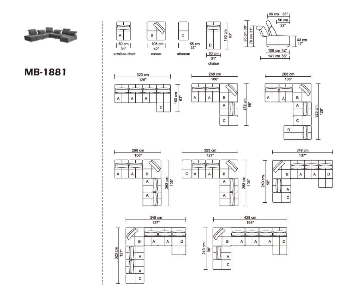 | Dimensions | Chaise: W31" x D63" x H31/38" Armless Chair: W31" x D42/55" x H31/38" Armless Chair: W31" x D42/55" x H31/38" Corner: W42" x D42" x H31" Armless Chair: W31" x D42/55" x H31/38" Armless Chair: W31" x D42/55" x H31/38" Ottoman: W22" x D42" x H17" Seat Depth: 22" - 38" Seat Height: 17" |