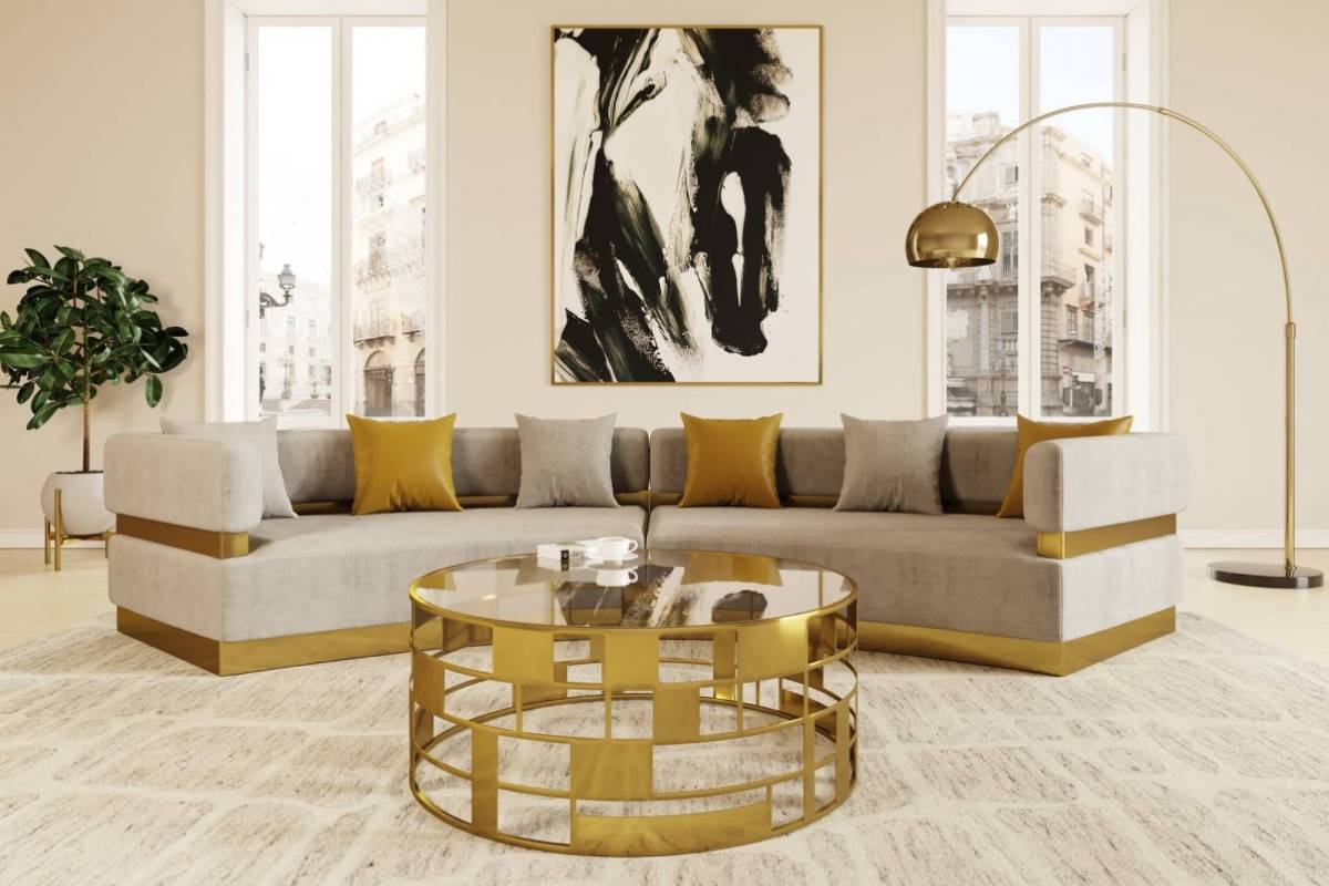 Divani Casa Kiva - Glam Beige and Gold Fabric Sectional Sofa
