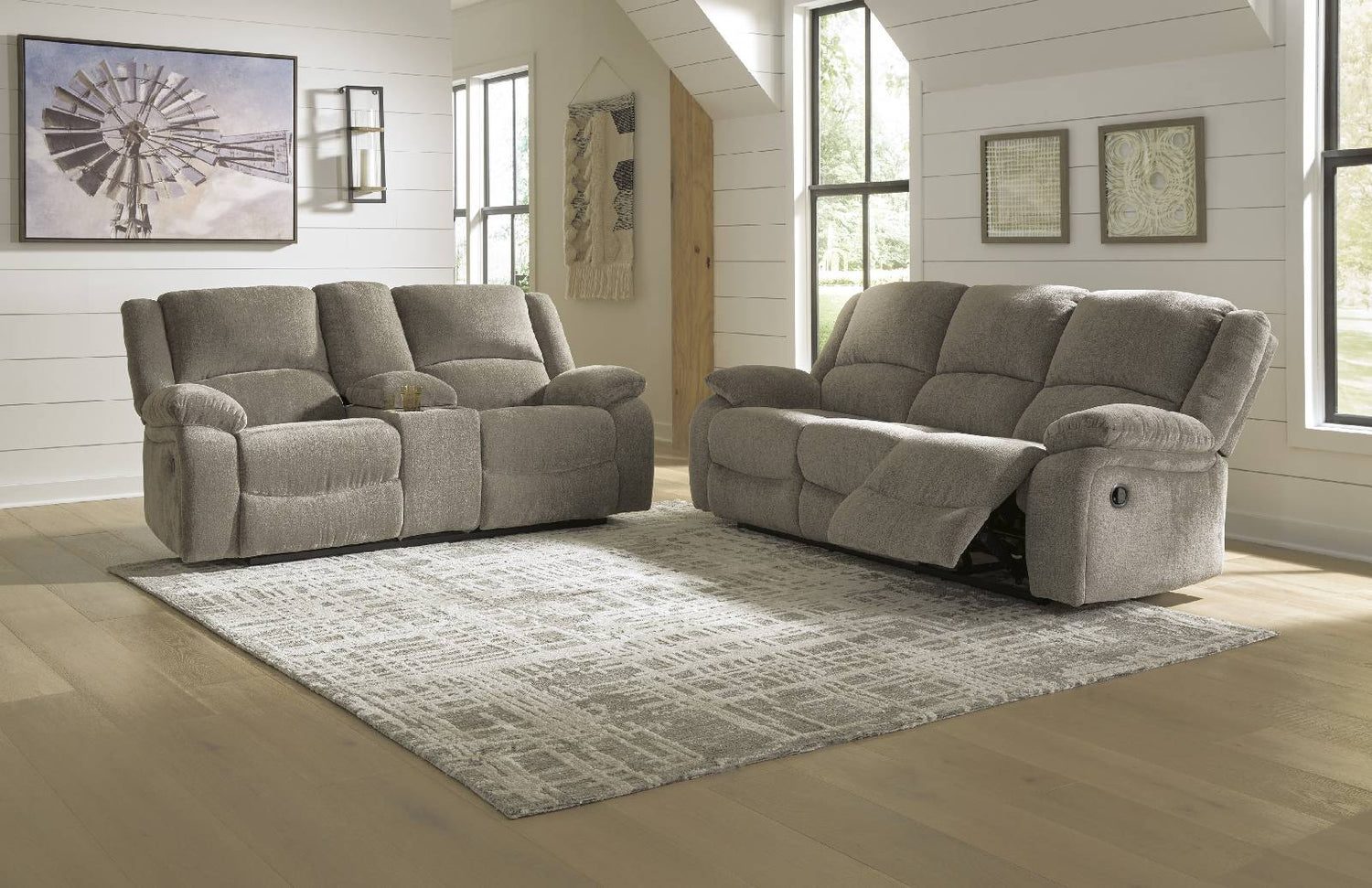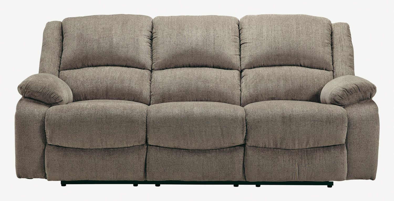 Built for luxury, the Draycoll power reclining sofa and loveseat combo lets you kick back in reliable style. The thick, softly textured chenille upholstery provides a comfy surface on which to lounge. With bustle back construction and thickly cushioned armrests, this set gives you the dependable support you need to unwind while handy USB ports provide the power to keep your devices going.- Includes reclining power sofa and reclining power loveseat with console