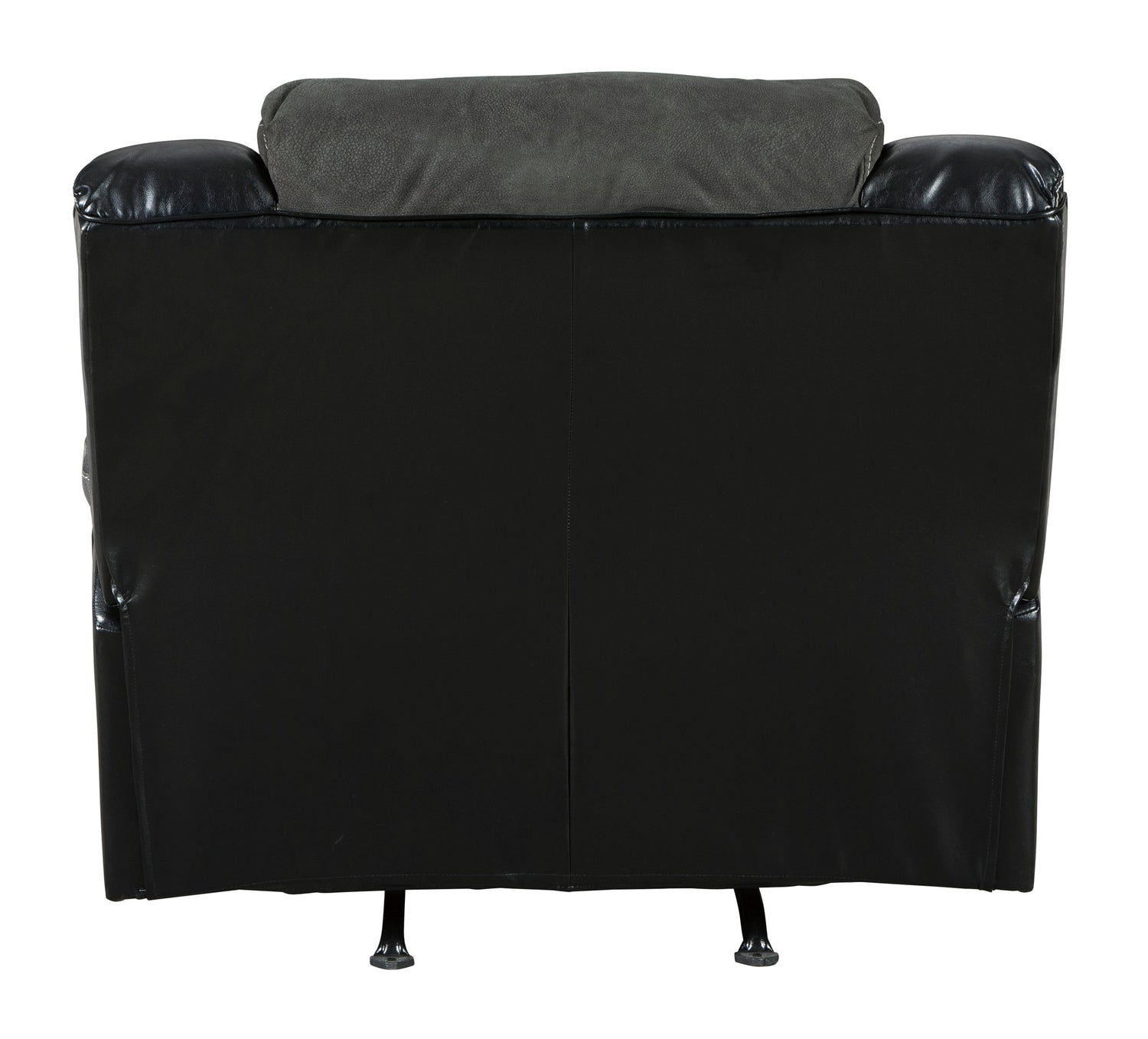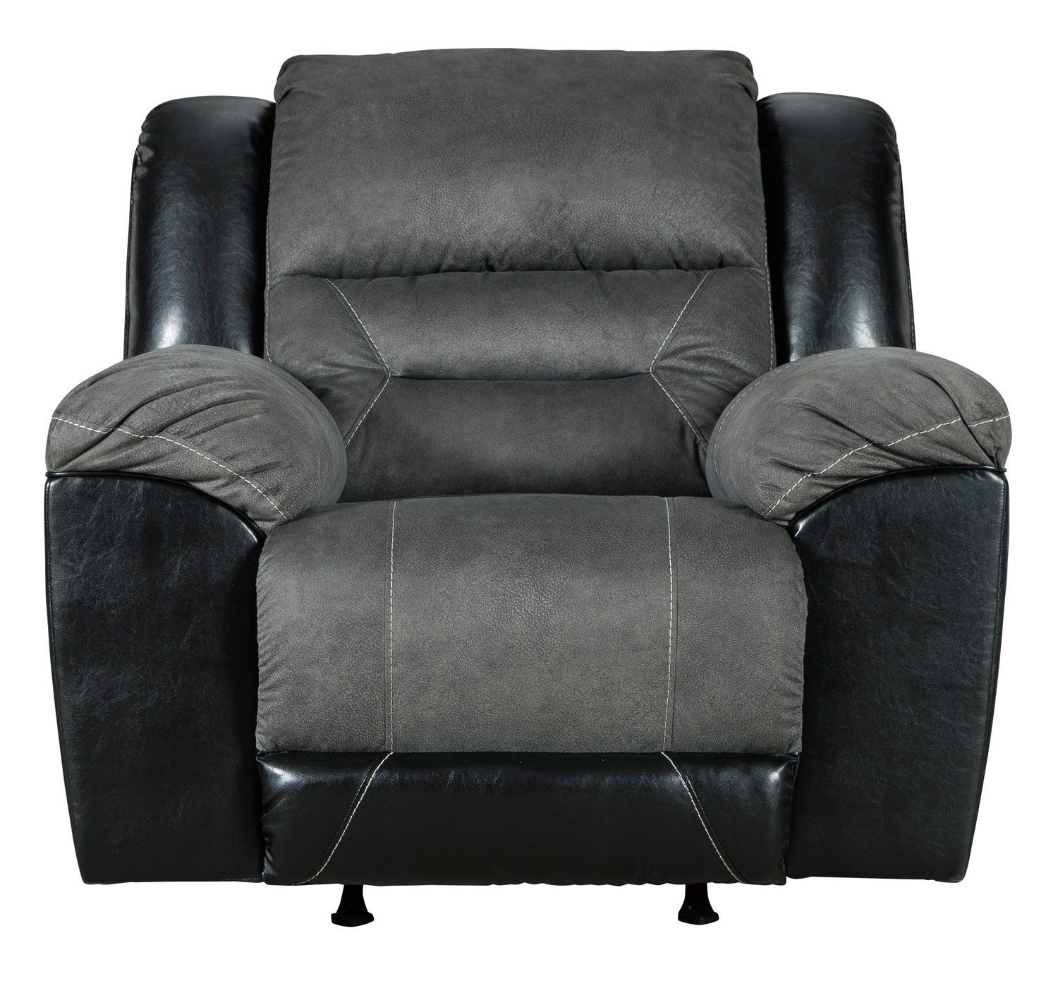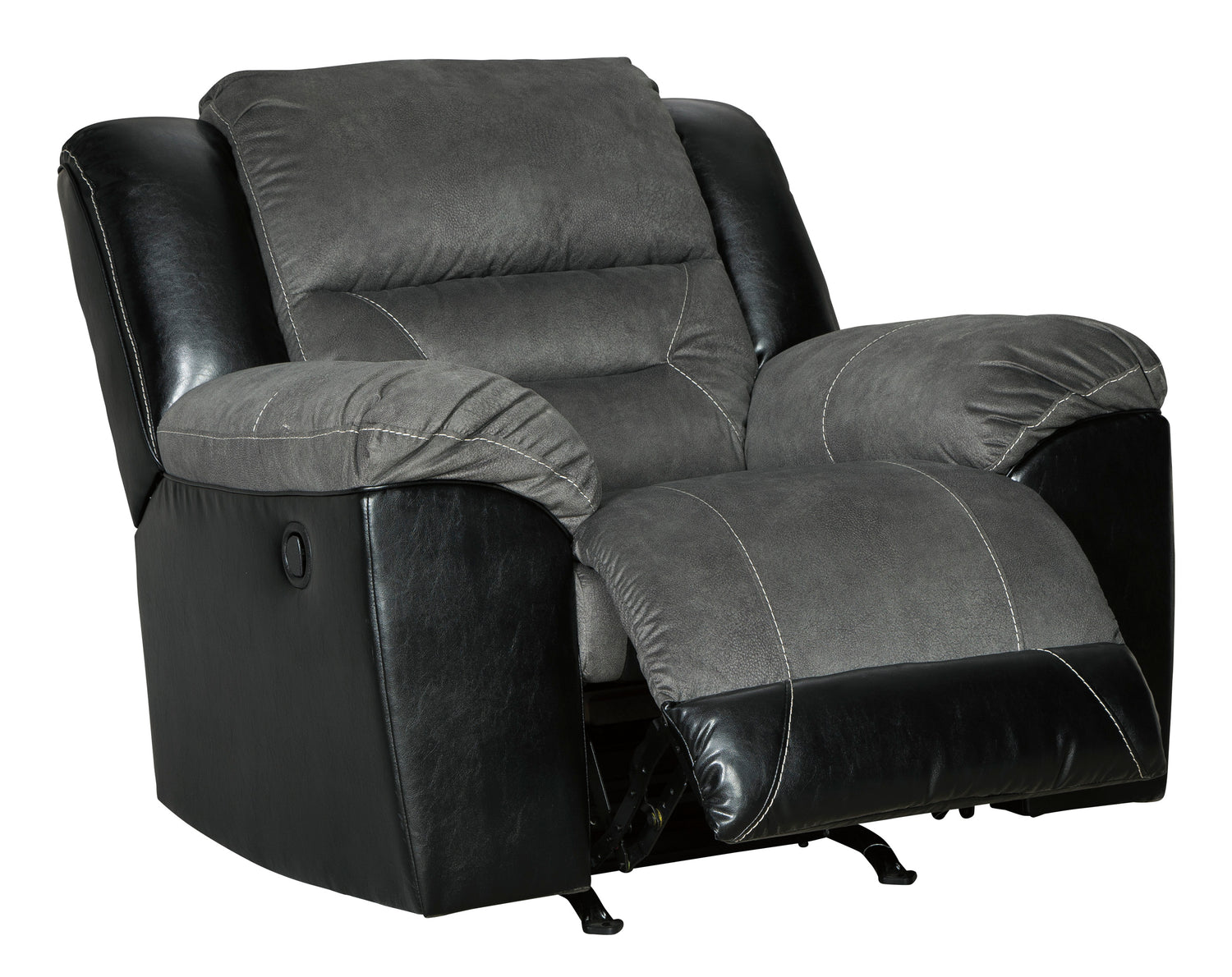 Every day is a good day with the Earhart rocker recliner around. Take a load off and forget your worries as you ease back into the luxurious feel of suede-like fabric. Faux leather covers the outside parts for an elevated look. Need more comfort and support for your body? Cue the deep seating and tall back. Contrast jumbo stitching adds an element of style to the cushions.- Corner-blocked frame with metal reinforced seat