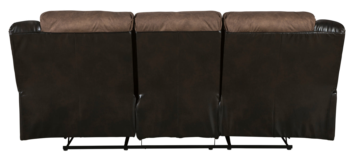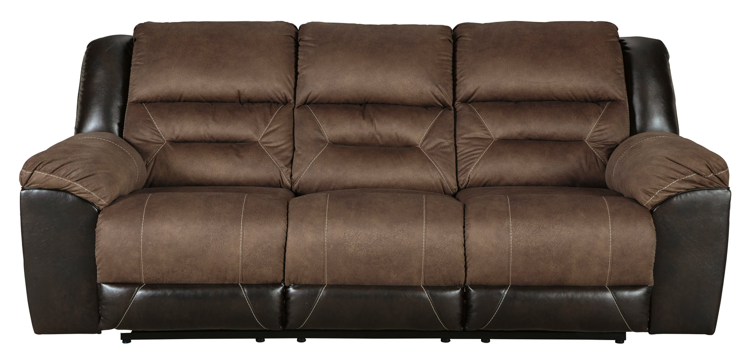 Every day is a good day with the Earhart reclining sofa and reclining loveseat with console. Take a load off and forget your worries as you ease back into the luxurious feel of suede-like fabric. Faux leather covers the outside parts for an elevated look. Need more comfort and support for your body? Cue the deep seating and tall back. Contrast jumbo stitching adds an element of style to the cushions.- Includes reclining sofa and reclining loveseat with console