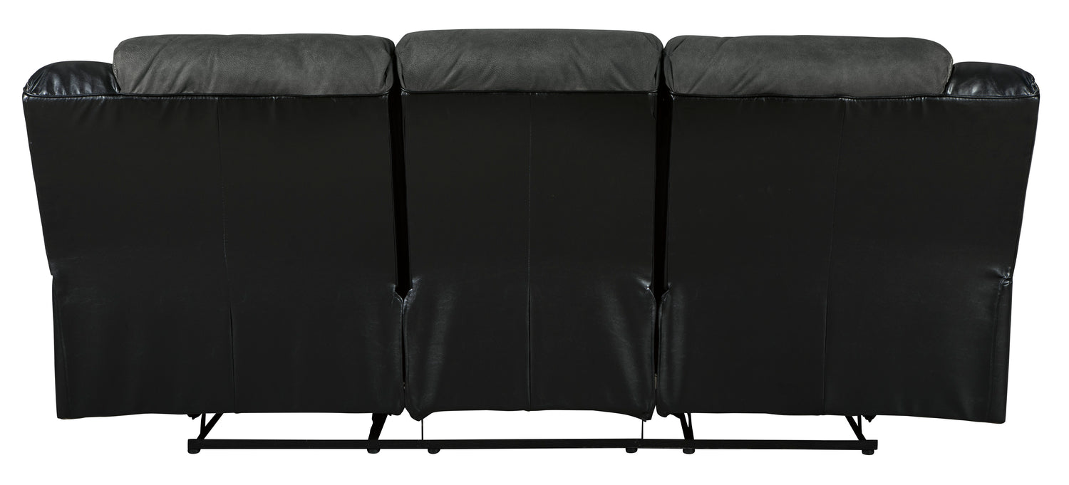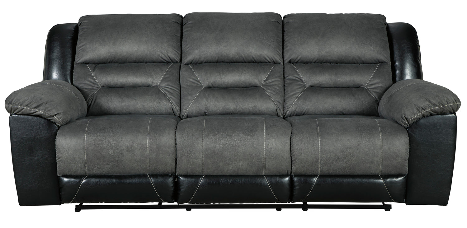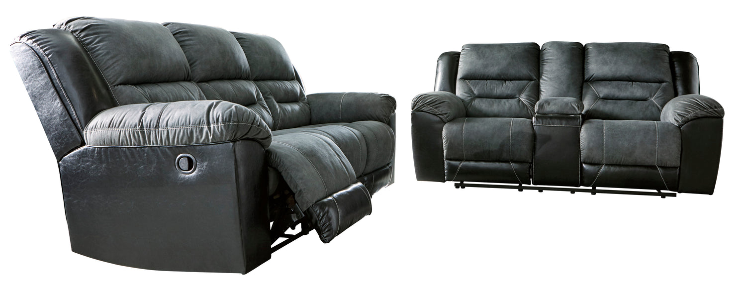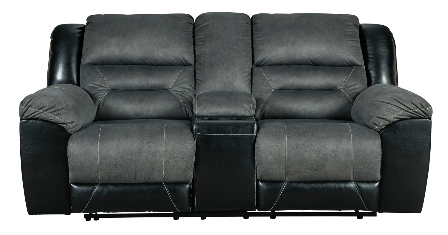 Every day is a good day with the Earhart reclining sofa and reclining loveseat with console. Take a load off and forget your worries as you ease back into the luxurious feel of suede-like fabric. Faux leather covers the outside parts for an elevated look. Need more comfort and support for your body? Cue the deep seating and tall back. Contrast jumbo stitching adds an element of style to the cushions.- Includes reclining sofa and reclining loveseat with console