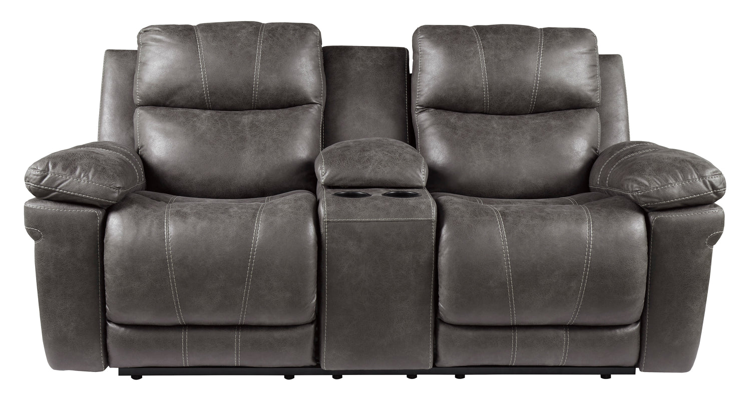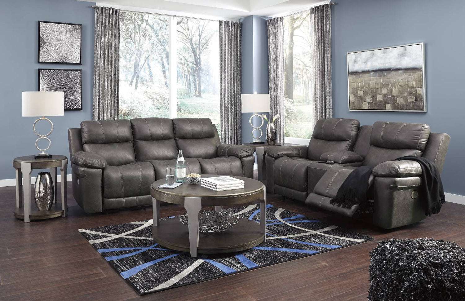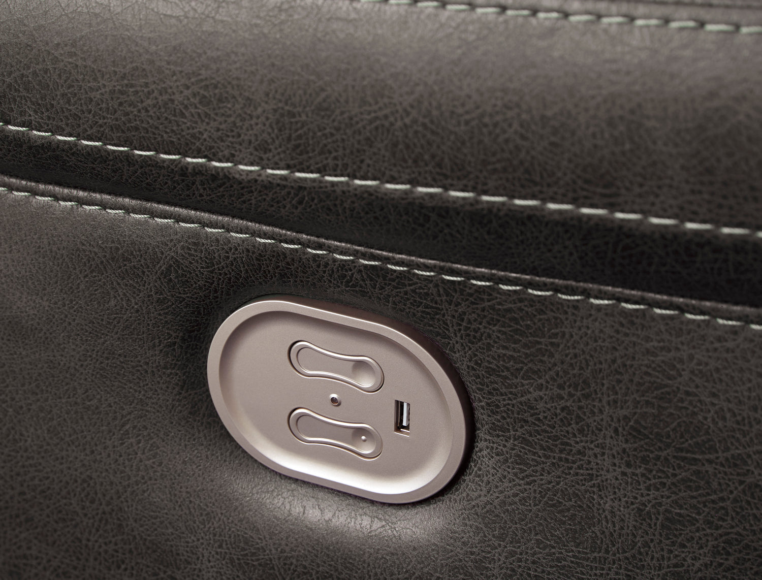 The Erlangen living room set with power reclining sofa and power reclining loveseat is coming in hot! Top-of-the-line faux leather fabric gives you the upscale look you want for less. Not to mention it feels incredible. Take a seat and raise your legs with one easy push of a button. The extended ottomans provide extra lengths for leg comfort. Want to watch TV or read in comfort? Easily fix your view with the power adjustable headrest. Complete with dramatic, jumbo stitching, this living room ensemble is out to capture your heart with style and comfort.- Includes power reclining sofa and power reclining loveseat