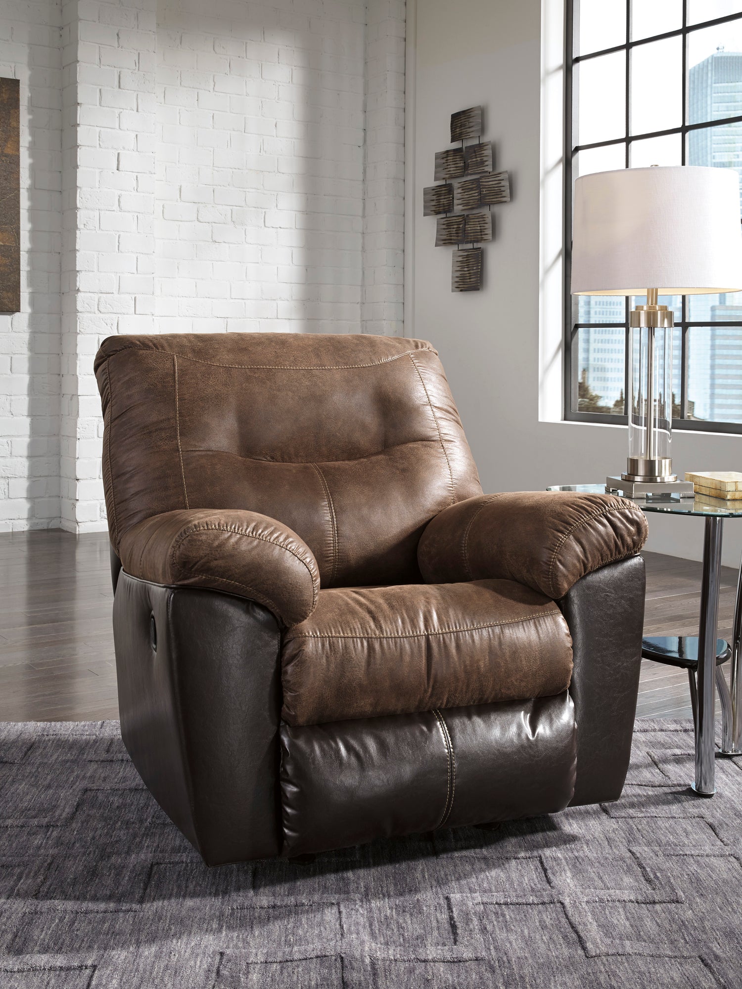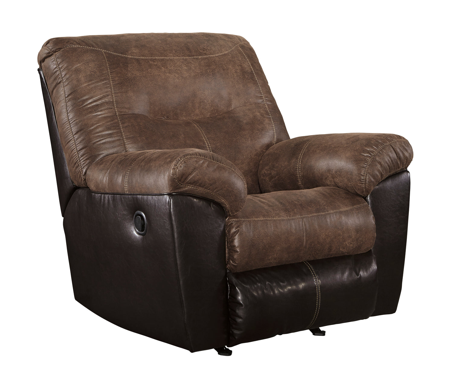 A classic split personality, the overstuffed Follett recliner is a real softie on the inside, but all business on the outside. Rest assured, the soft suede-like material is a perfect complement to the faux leather exterior giving it just the right amount of interest and character. A perfectly paired piece, comfortably priced.- Gentle rocking motion