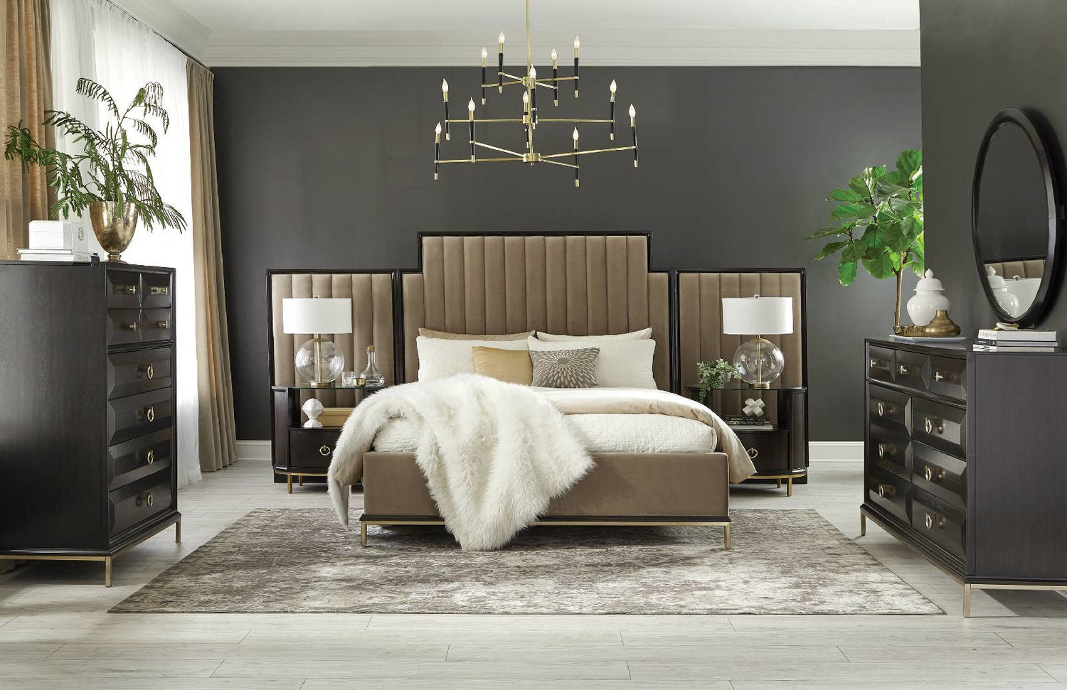 This Art Deco-inspired upholstered bed room set rekindles the glory of the Old Hollywood era with elegance and clean, crisp lines. This splendid bed is fashioned from solid poplar, walnut veneer, plywood, and MDF. Bed is upholstered in velvet and features a rich Americano finish. Other stylish elements include 3D-beveled panels and lustrous rose brass hardware