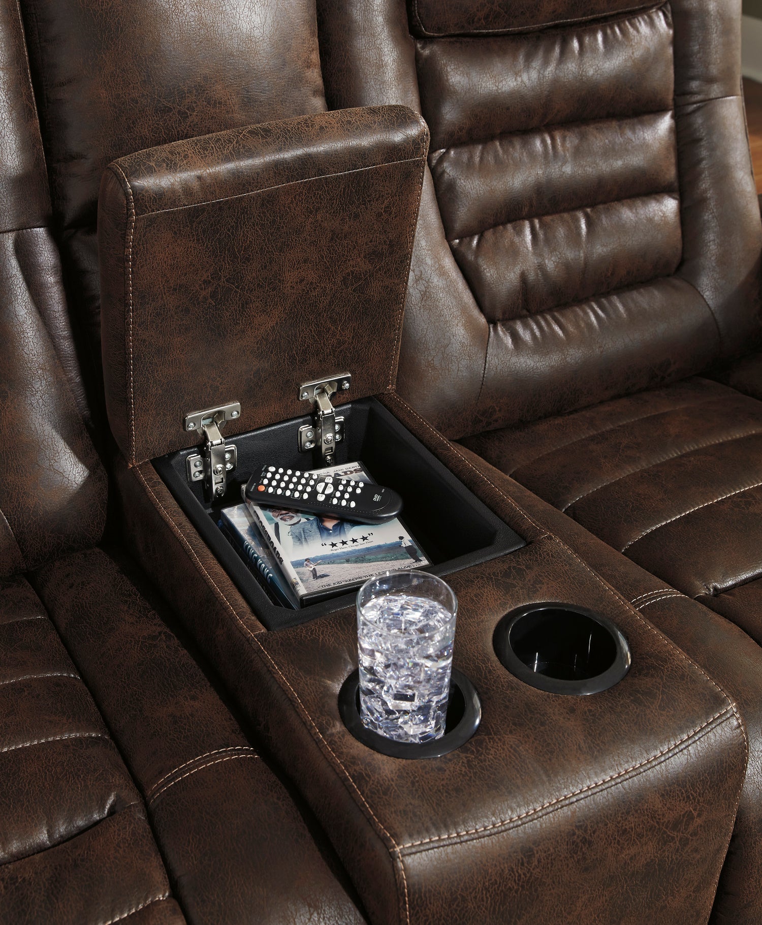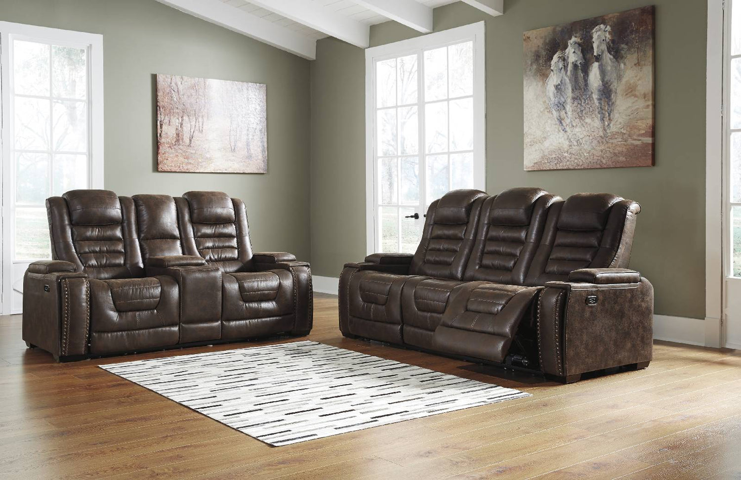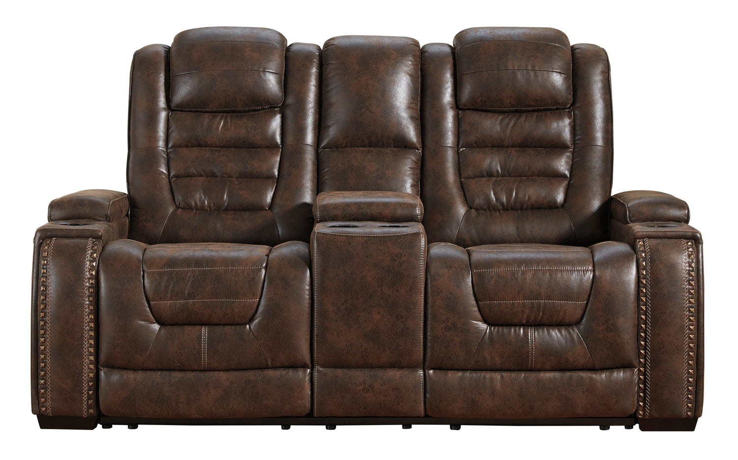 If you’re looking for the perfect seating arrangement for gaming, lounging or just relaxing, look no further than the indulgent comfort of the Game Zone power reclining sofa and loveseat set. Sporting one-touch power controls, Easy View™ power adjustable headrests, cup holders, storage and chargers, these dual-sided reclining seats have everything you need for binge-watching or power playing. Padded cushions with waterfall back design and pillow top arms offer plenty of support, while leather alternative upholstery is given tuck and roll styling for a well-edited aesthetic. The loveseat’s center console is equipped with underneath storage, cup holders and USB charging, while the dual-sided sofa’s stationary middle seat folds down to reveal a table perfect for holding a laptop or snacks. How’s that for handy?- Includes power reclining sofa and power reclining loveseat with console