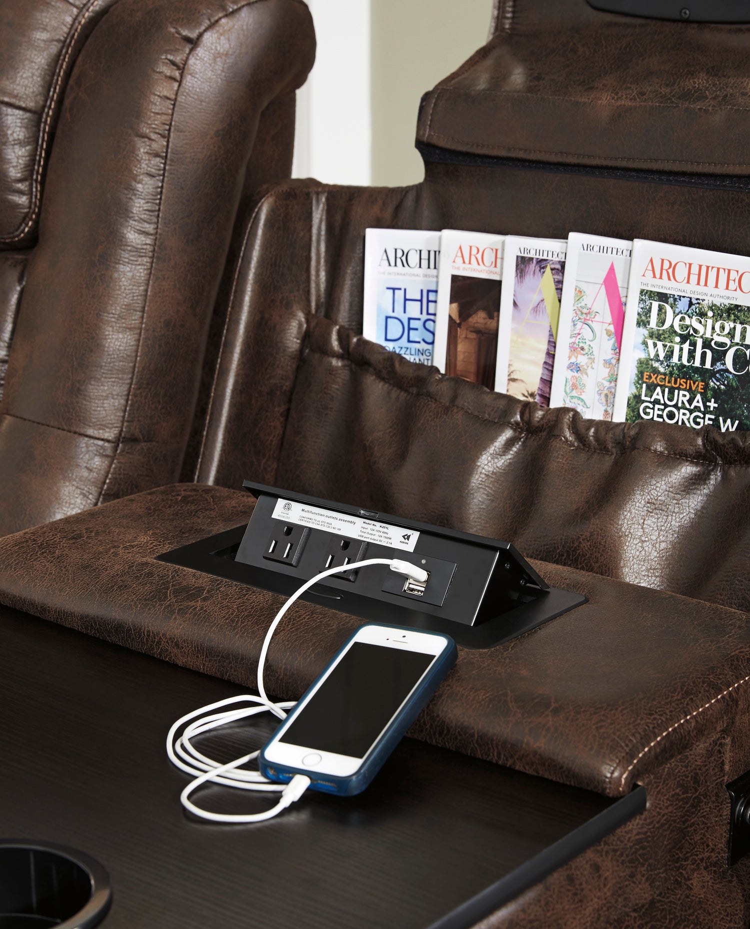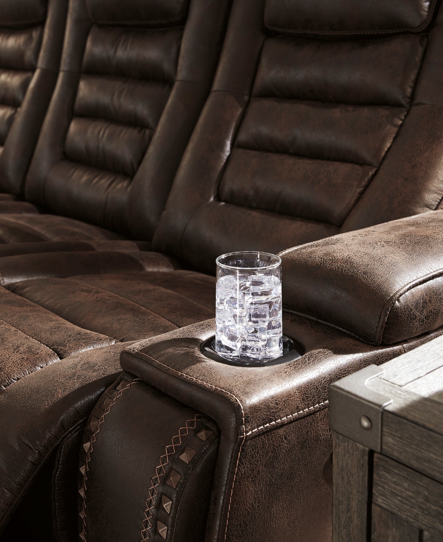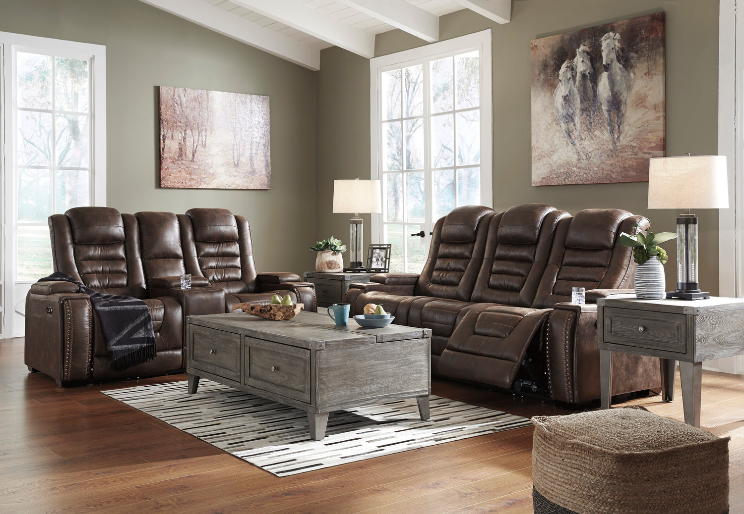 If you’re looking for the perfect seating arrangement for gaming, lounging or just relaxing, look no further than the indulgent comfort of the Game Zone power reclining sofa and loveseat set. Sporting one-touch power controls, Easy View™ power adjustable headrests, cup holders, storage and chargers, these dual-sided reclining seats have everything you need for binge-watching or power playing. Padded cushions with waterfall back design and pillow top arms offer plenty of support, while leather alternative upholstery is given tuck and roll styling for a well-edited aesthetic. The loveseat’s center console is equipped with underneath storage, cup holders and USB charging, while the dual-sided sofa’s stationary middle seat folds down to reveal a table perfect for holding a laptop or snacks. How’s that for handy?- Includes power reclining sofa and power reclining loveseat with console