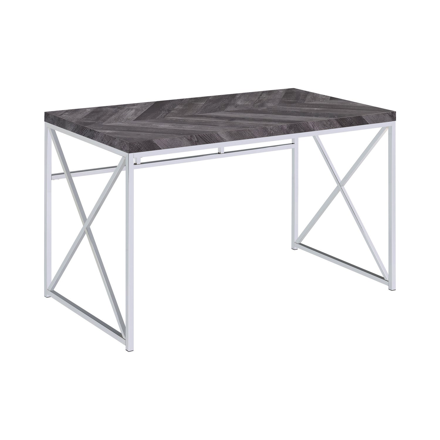 With a chic, simple silhouette, this wooden writing desk lends understated glamour to any space. Its metal base features sleek, straight lines and bold, X-shaped accents. A shimmering chrome finish adds a brilliant infusion of polished shine. Its wooden surface boasts an eye-catching, rustic grey herringbone finish for a touch of artful appeal. Place this contemporary writing desk in a living room, den, or home office to create an appealing, minimalist look.
