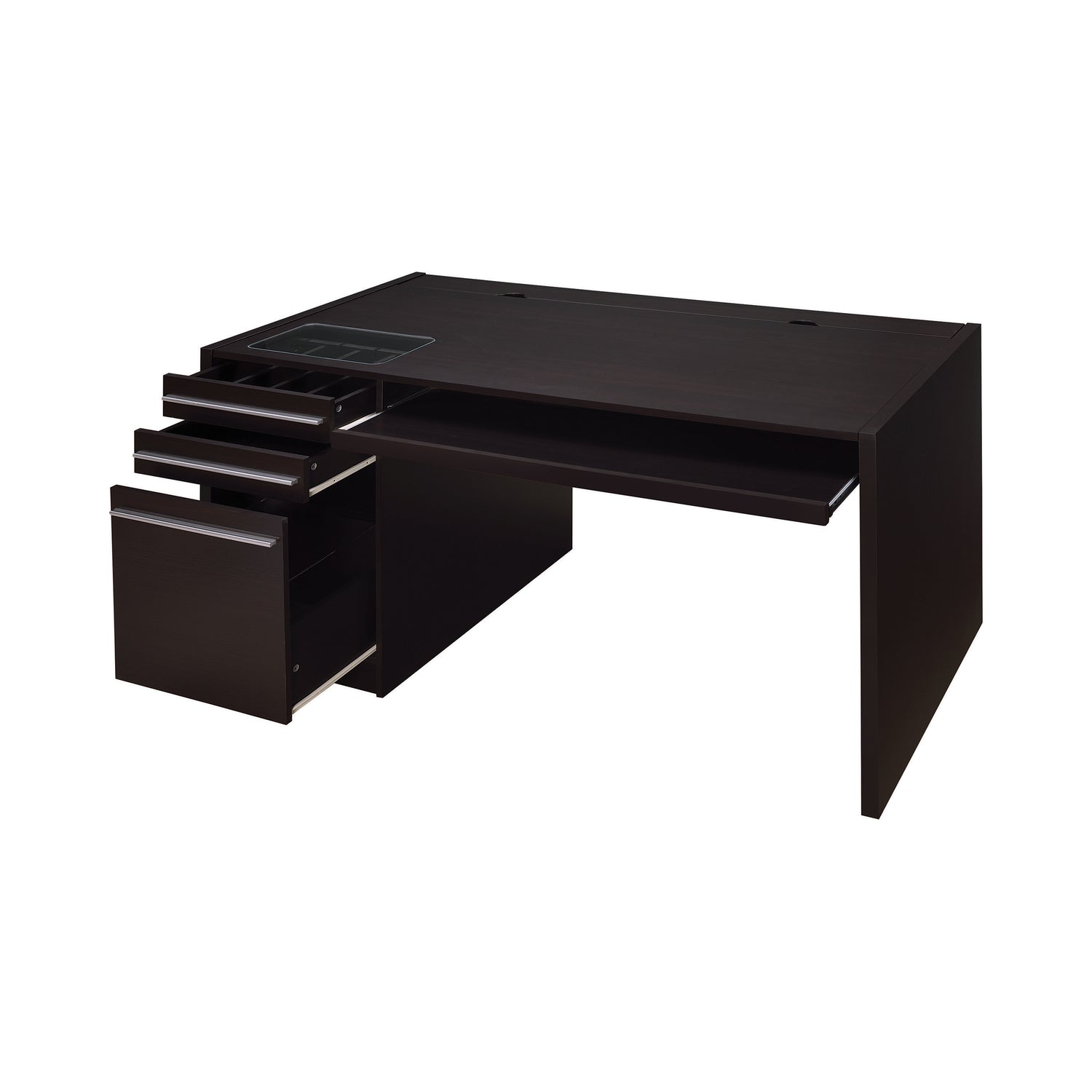 A modular design scheme adds function and personality to a modern task space. This connect-it computer desk conquers basic operations and lends a stylish contemporary look. Finished in bold cappuccino, its linear silver hardware pulls offer a cool touch. Find storage space in three side drawers with Euro glides and a center keyboard drawer that makes computing a snap. Spruce up a compact contemporary office or home space with this exceptional desk.