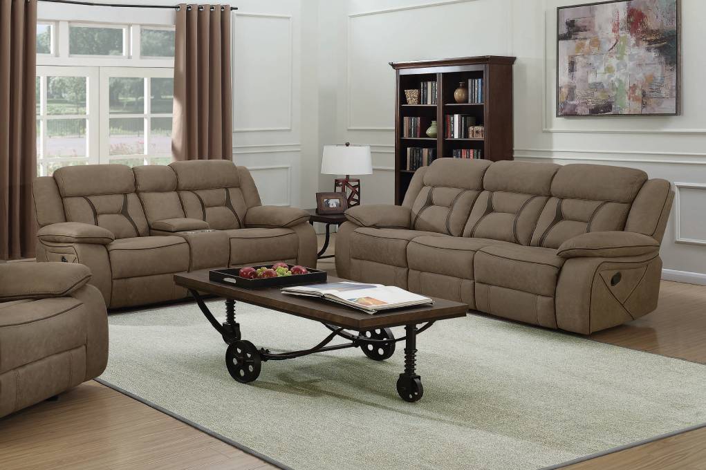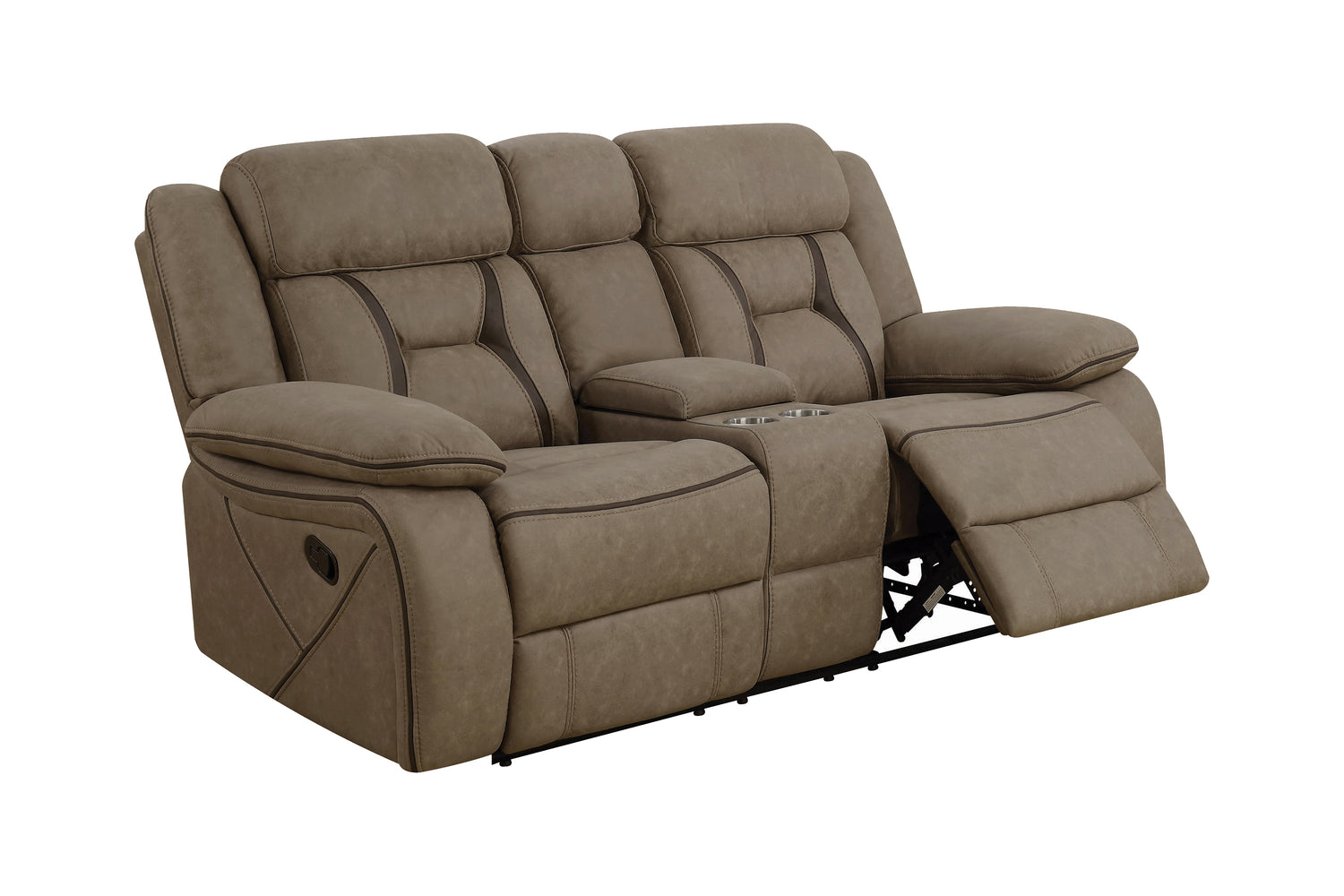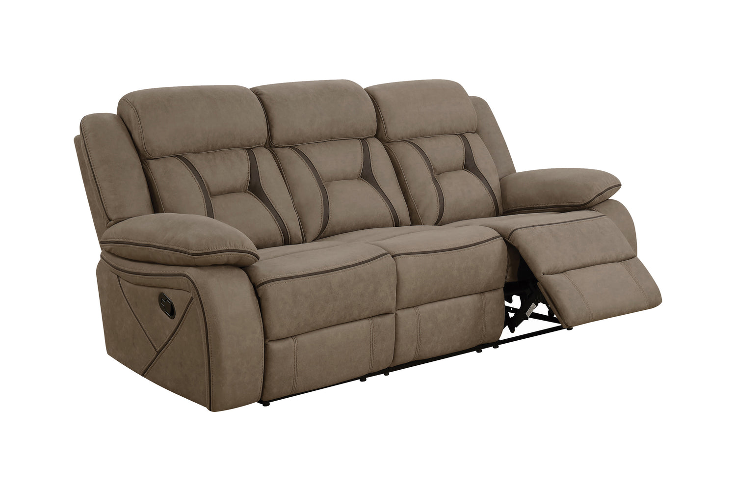 - Motion sofa collection upholstered in tan performance-grade coated microfiber