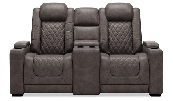 The Hyllmont power reclining loveseat in trendy gray is proof of just how far recliners have come when it comes to form and function. Ultra cool and contemporary, this fully loaded power reclining loveseat makes it so easy to social distance and make home your haven. Dressed to impress with diamond stitching inspired by sports car interiors, this reclining loveseat is covered in a fabulous faux leather with pebbled effect for authenticity. High-tech advancements include a one-touch power control with Easy View™ adjustable headrest and USB plug-in. Hidden storage compartments in the armrests and console are a welcome touch.- Dual-sided recliner