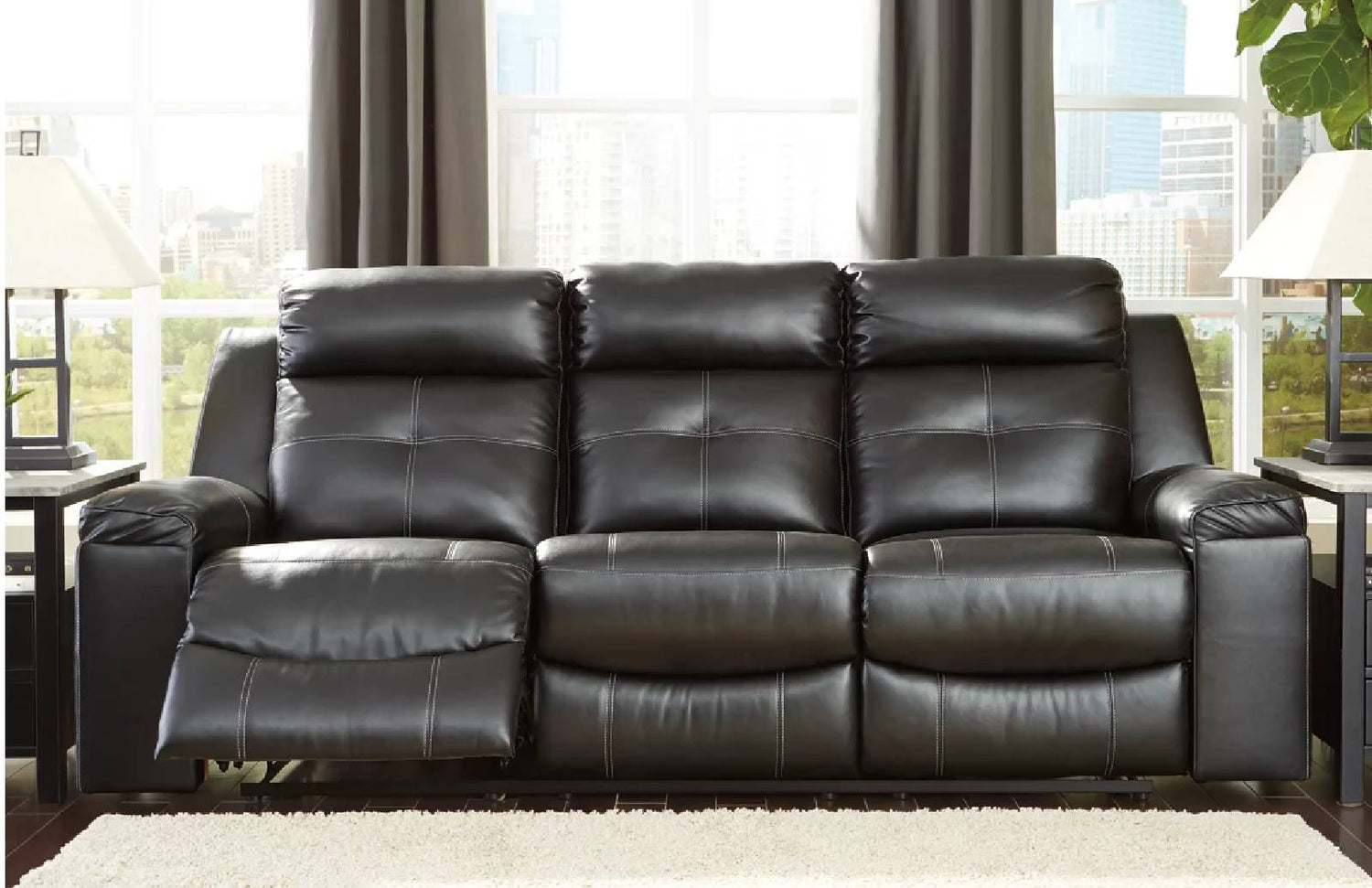 You don’t just want to recline. You want to recline in high design. Wrapped in a fabulous black faux leather upholstery, the Kempten reclining sofa with 42" high back is everything you long for—and then some. Ultra clean lines, subtle curves and sumptuous comfort make it a sight for sore eyes and tired muscles. Here’s the showstopper: ambient blue LED lighting along the sofa base for a movie theater experience enjoyed from the convenience of home.- Dual-sided recliner; middle seat remains stationary
