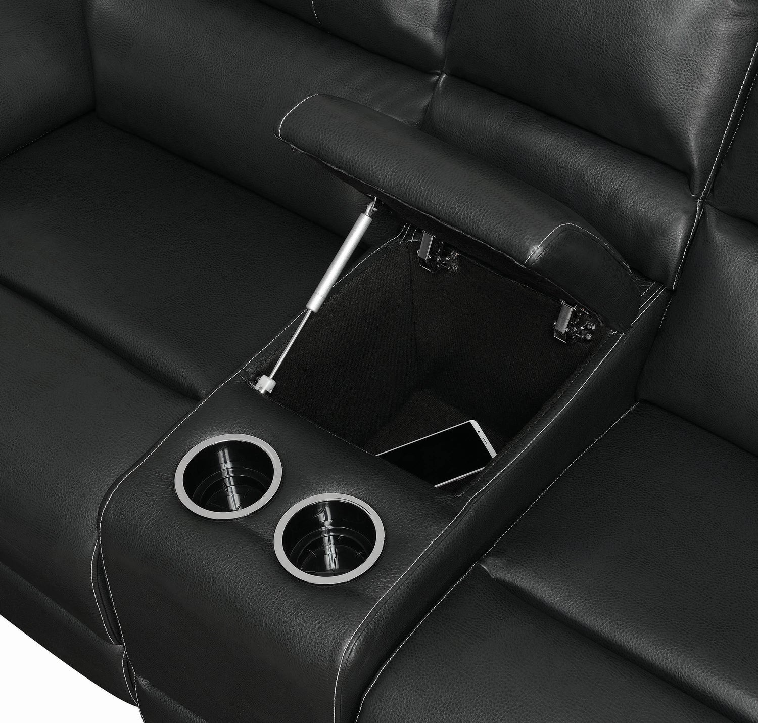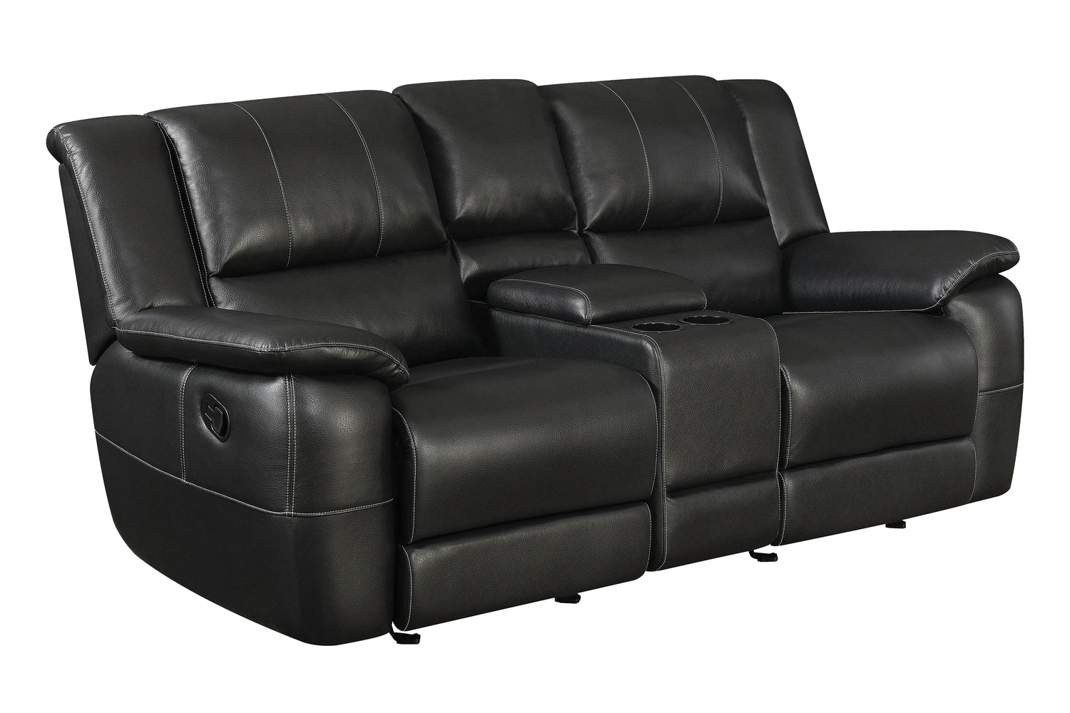 - Loveseat features smooth gliding mechanism, console with lift top storage, and two removable stainless steel cup holders