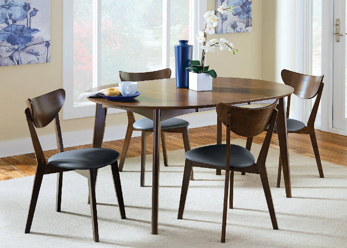 Mid-century modern-inspired, this five-piece dining set is full of clean lines. Constructed of solid wood, the table and four side chairs feature an open silhouette and clean lines. Tapered legs angle outwards as is signature to the retro design. In a dark walnut finish, the deeply curved back creates a stunning visual while adding gentle support. Complete with an upholstered seat and removable extension leaf, this seat is great for dinner parties.