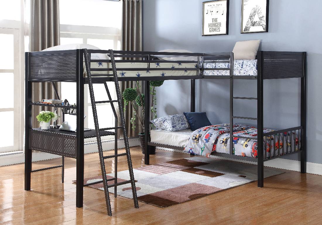 Quickly perk up a youth bedroom with this streamlined twin over twin bunk bed with a loft add-on. Coming in a two-tone black and gunmetal finish, this piece is versatile and stylish. Heavy gauge guard rails offer protection and peace of mind for little ones on the top bunk, accessible by using an attached ladder. Enjoy the function of the loft add-on, coming equipped with a workstation, shelf and pencil holders. Choose this twin bunk bed with loft add-on for compact sleeping spaces.