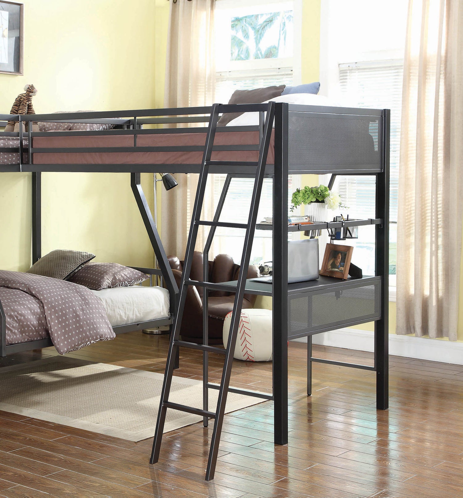 A twin over full bunk bed with a loft add-on is all that you need for compact sleeping spaces. The twin bunk bed is accessible with an attached ladder crafted from heavy gauge steel and a loft-add on creates a stylish and functional study space at home. The loft includes a workstation, shelf and pencil holders. This twin over full bunk bed is finished in black and gunmetal for versatile appeal. Choose this piece for a multi-functional upgrade in your home.
