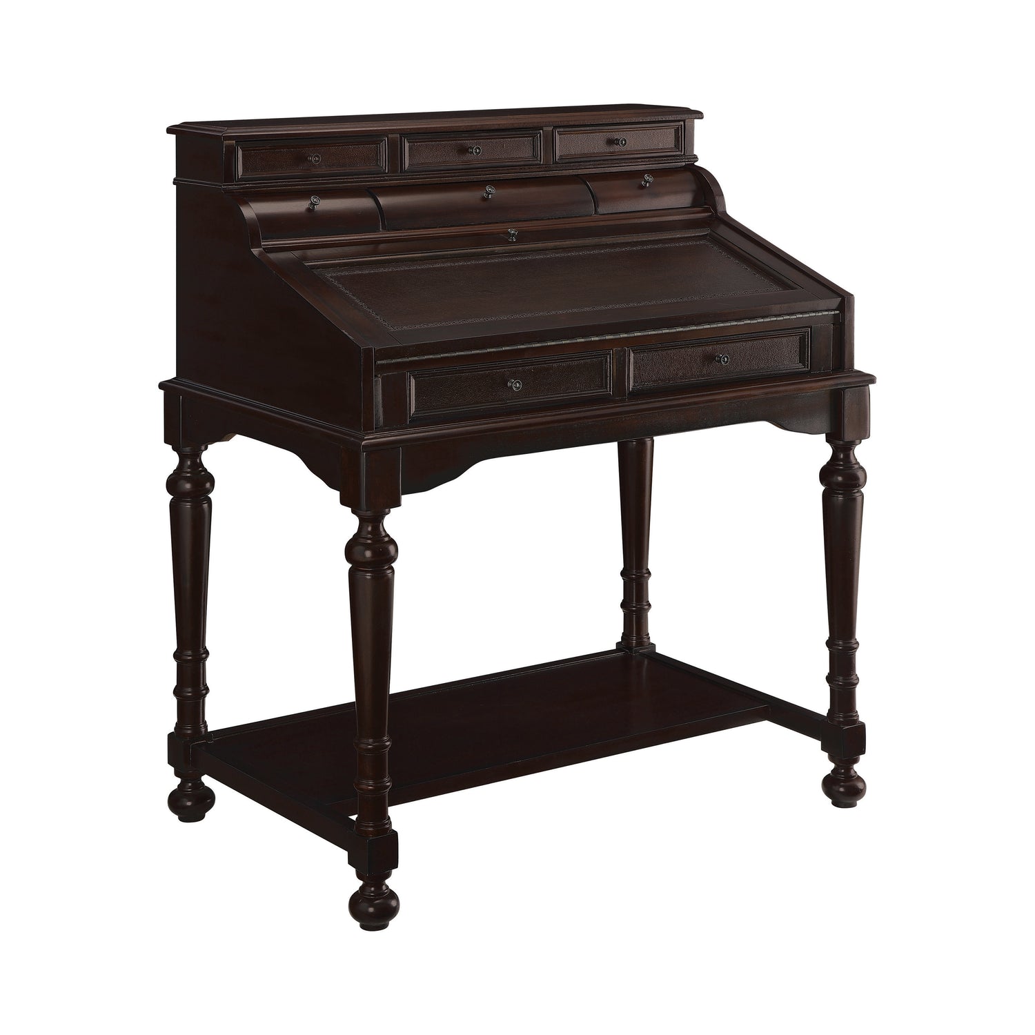 The refined beauty of this stylish secretary desk brings a room together in style. A warm brown finish adds depth and flair to its graceful silhouette. Its bonded leather writing surface expands, revealing a larger surface for more extensive projects. With a large lower shelf and ten convenient drawers, it offers a variety of options for storage. With its sleek structure and compact size, this desk is ideal for smaller spaces.