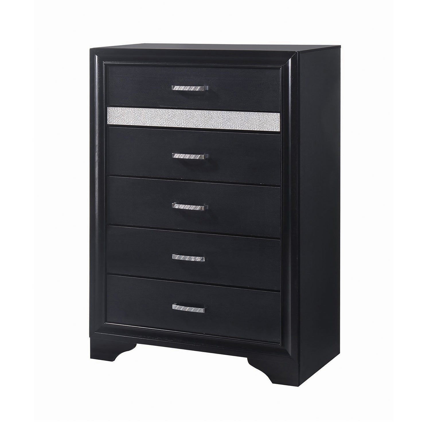 Create the bedroom of your dreams with this elegant, five-piece furniture set. Complete with a bed, nightstand, dresser, mirror and chest, it has all you need to complete your space. Each case piece includes a hidden jewelry drawer to keep valuables safe and secure. The two additional drawers built into the bed are ideal for storing shoes, bedding, clothing, and more. Each piece in this set is finished in a solid color for an appealing, monochromatic look.