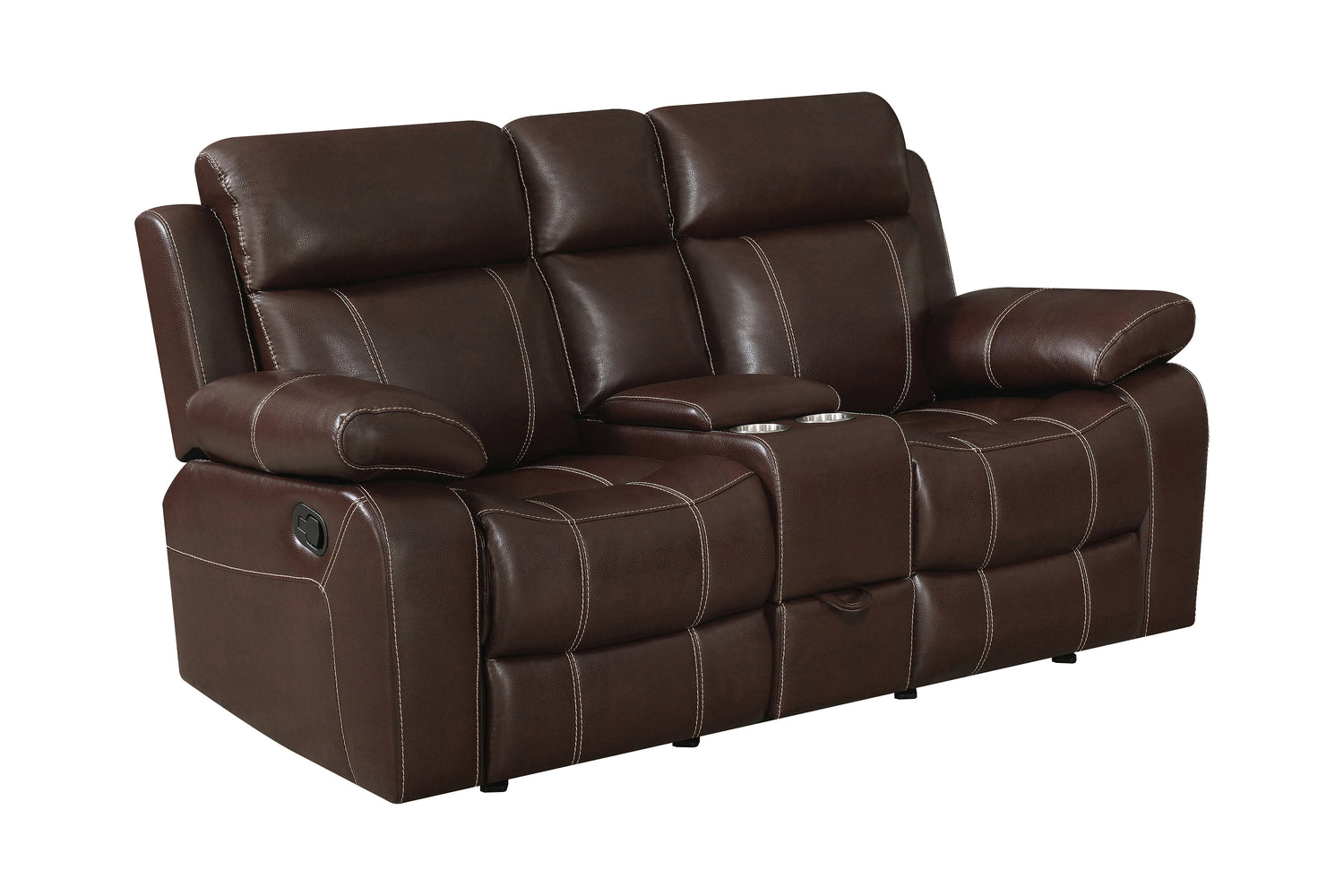 - Loveseat features smooth gliding mechanism, console with lift top storage, two removable stainless steel cup holders, and hidden storage drawer
