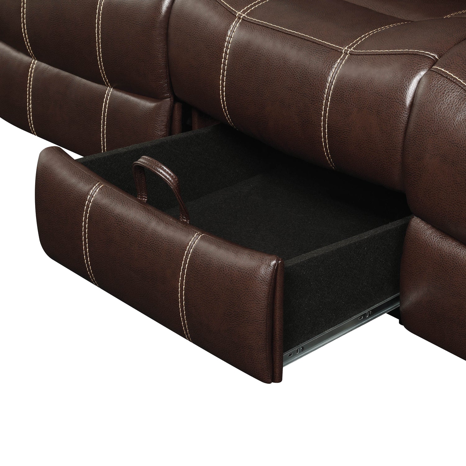 - Motion sofa collection upholstered in chestnut performance-grade leatherette
