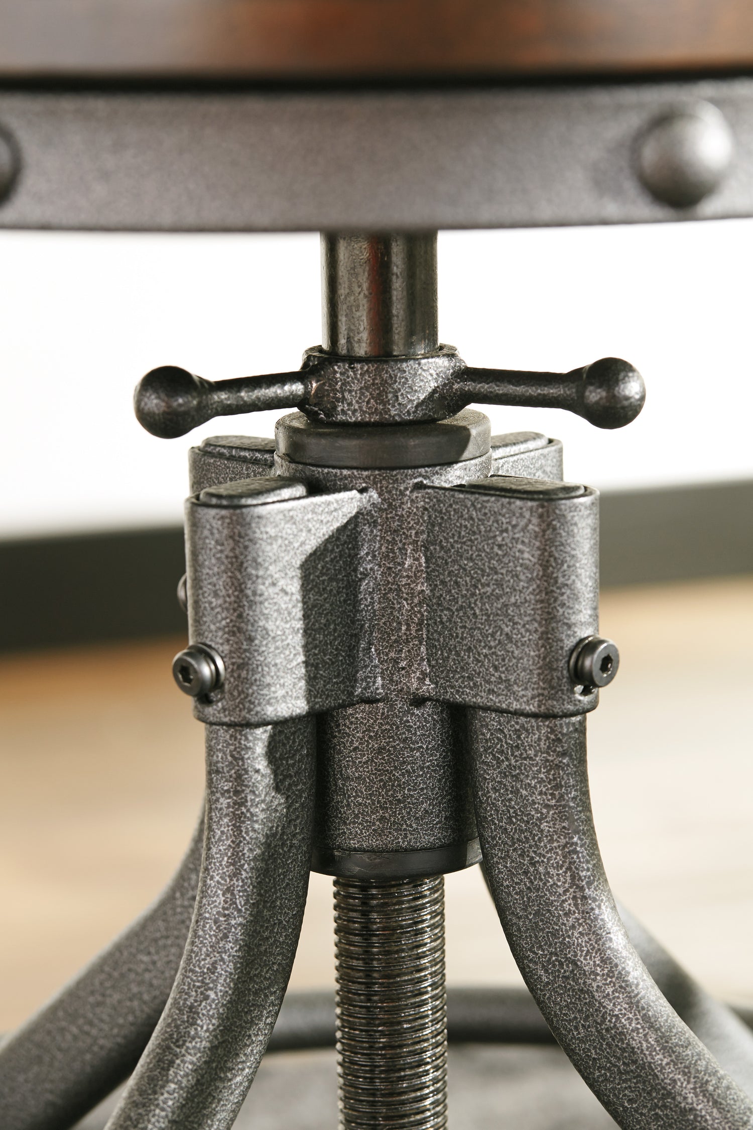 Take casual dining to new heights with the Odium counter height dining room table and bar stools. Discover how the dark bronze-tone powder coat metal finish and the planked looking top and swivel stools reflect rustic, industrial style. The table and stools are adjustable, an added bonus for accommodating everyone on game night.- Made of metal, engineered wood and birch veneers