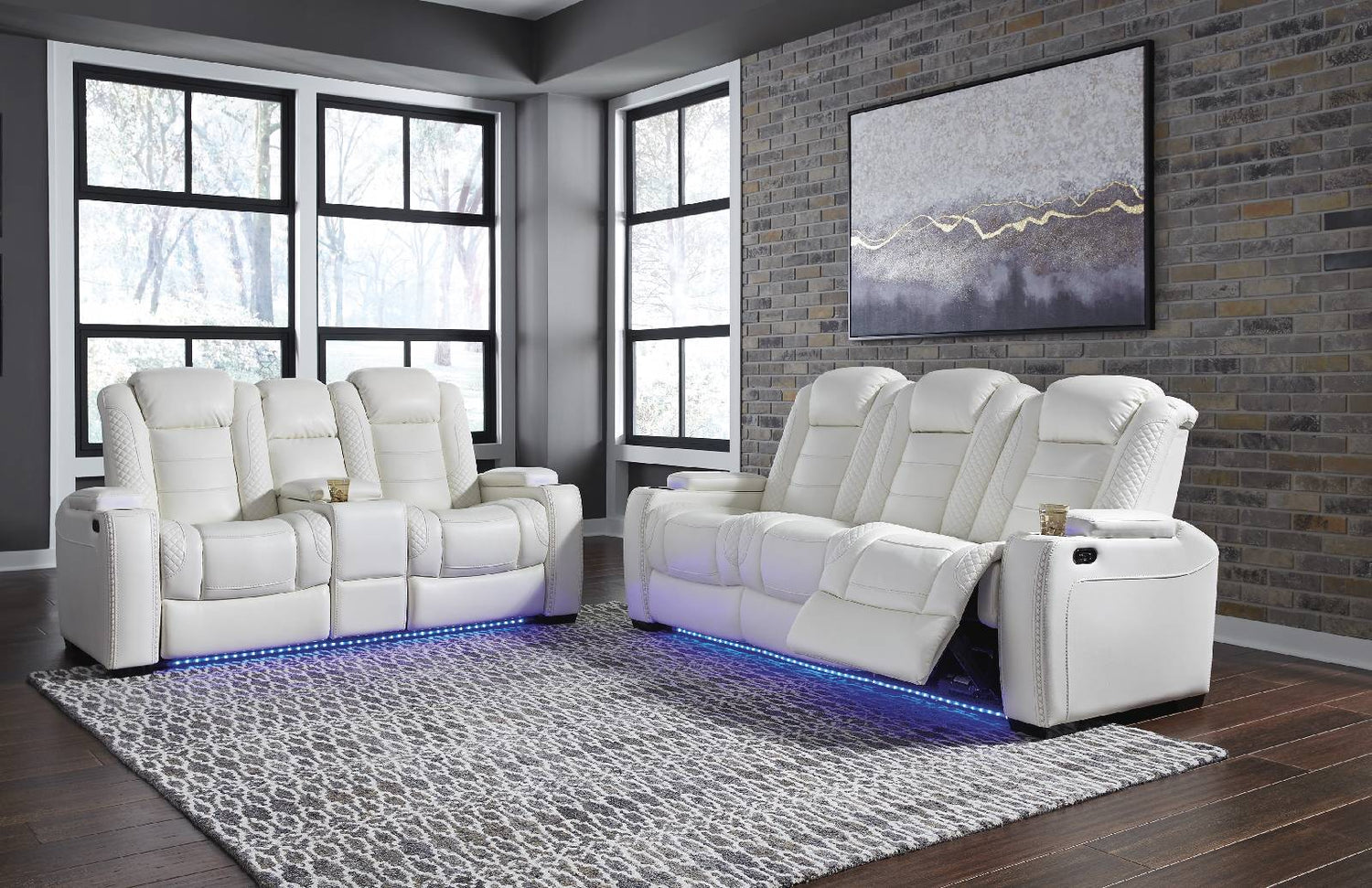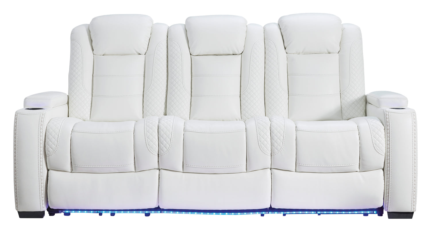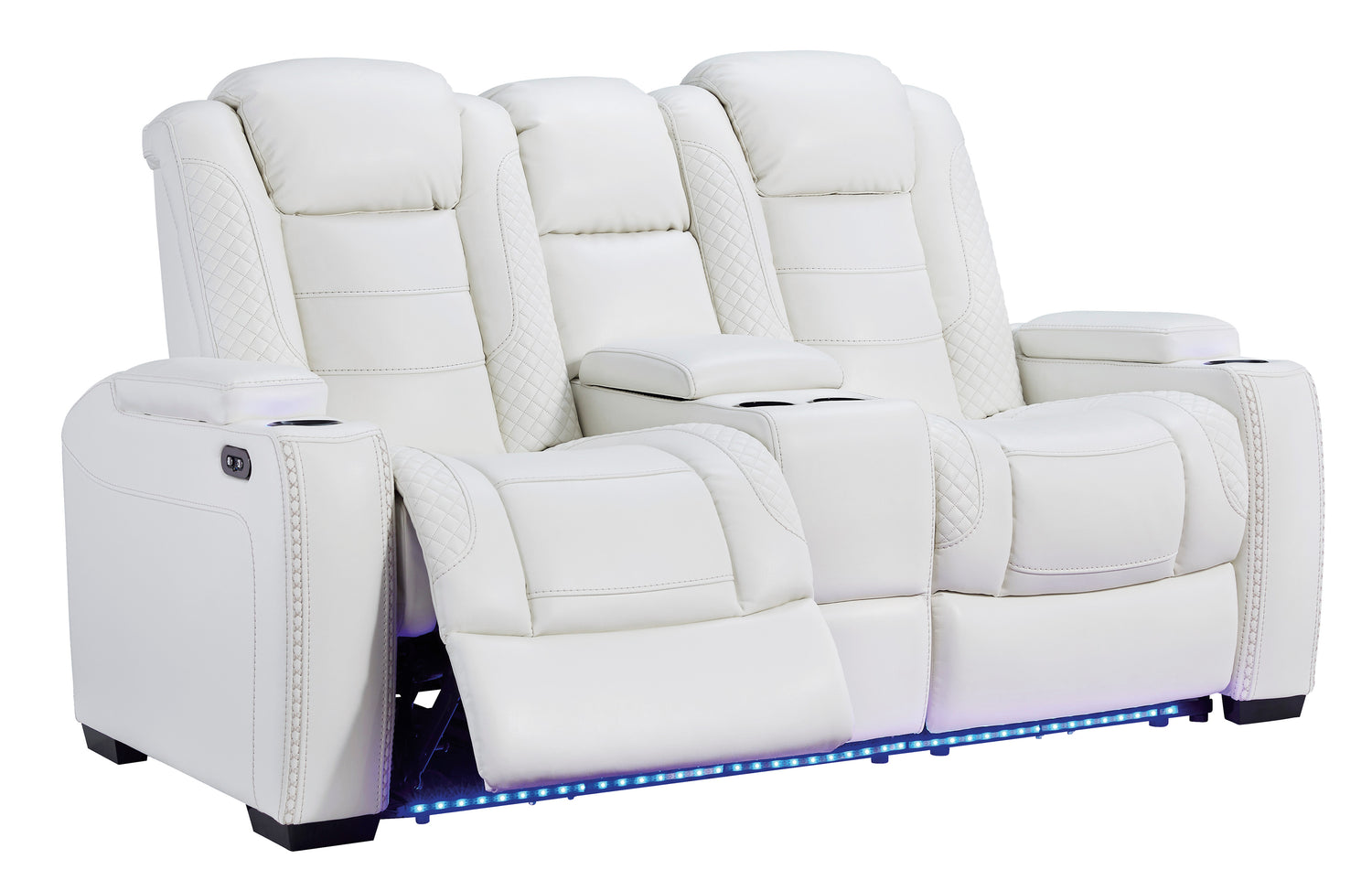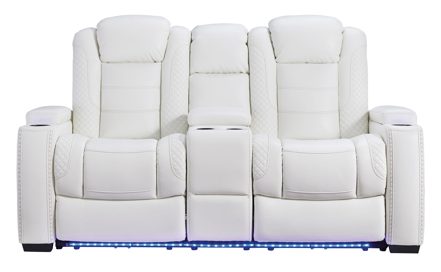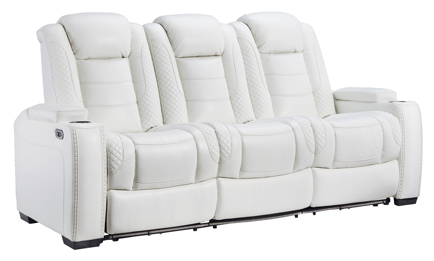 The Party Time power reclining sofa and loveseat set takes its cue from luxury automobiles with lattice- and cross-hatch stitching, for a richly tailored aesthetic that gives you plenty of reasons to celebrate. Sumptuously padded cushions and crisp white faux leather upholstery add to the indulgence. When it’s time to rev up the action, the set’s dual reclining bucket seats, Easy View™ power adjustable headrests, LED accent lighting and USB charging ports keep you in the driver’s seat.- Includes power reclining loveseat with console and power reclining sofa